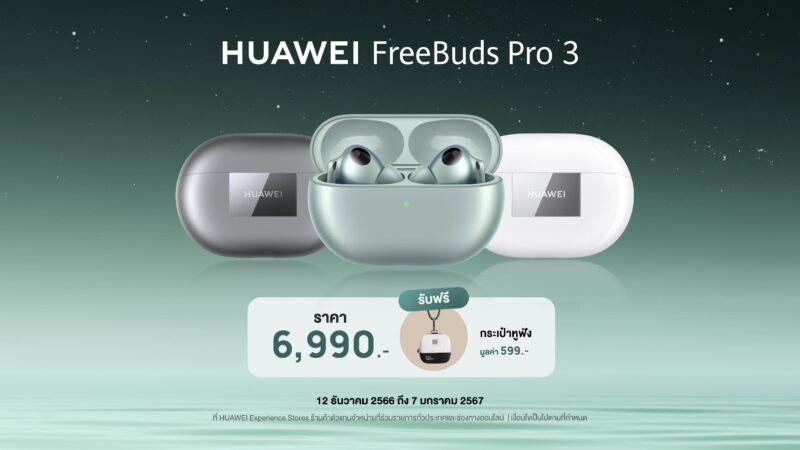 HUAWEI FreeBuds Pro 3 วางจำหน่ายในราคา 6,990 บาท รับฟรี กระเป๋าหูฟัง มูลค่า 599 บาท เมื่อสั่งซื้อตั้งแต่วันที่ 12 ธันวาคม 2566 ถึง 7 มกราคม 2567 ที่ HUAWEI Experience Store ร้านค้าตัวแทนจำหน่ายที่ร่วมรายการ และร้านค้าอย่างเป็นทางการของหัวเว่ยบนแพลตฟอร์มออนไลน์ Lazada และ Shopee