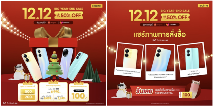 - กิจกรรมตอบแทนลูกค้า realme เพียงเขียนแชร์ความรู้สึกดี ๆ ลงในรีวิวเพจ พร้อมแนบรูปที่สั่งซื้อสมาร์ตโฟนในช่วง 12.12 แคปหน้าจอส่งไปที่ realme Official ของ Shopee หรือ Lazada รับฟรี แก้วน้ำเก็บความเย็นหรือคูปองส่วนลด 100 บาท (วันละ 10 ท่าน)