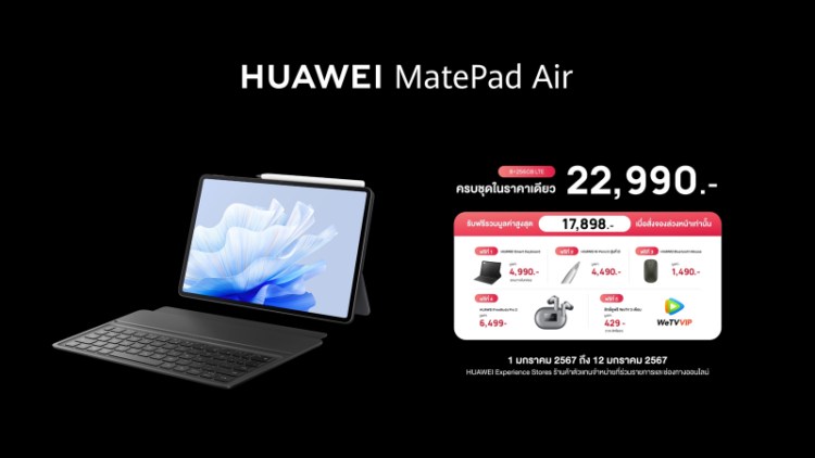 HUAWEI MatePad Air (8+256GB LTE) วางจำหน่ายในราคา 22,990 บาท โดยลูกค้าสามารถพรีออเดอร์ได้ตั้งแต่วันที่ 1 มกราคม 2567 – 12 มกราคม 2567 รับทันที HUAWEI Smart Keyboard มูลค่า 4,990 บาท HUAWEI M-Pencil (รุ่นที่ 2) มูลค่า 4,490 บาท HUAWEI Bluetooth Mouse มูลค่า 1,490 บาท HUAWEI FreeBuds Pro 2 มูลค่า 6,499 บาท และ WeTV VIP 3 เดือน มูลค่า 429 บาท (100 สิทธิ์แรก) โดยสั่งจองได้ผ่านหน้าร้าน HUAWEI Experience Store และร้านค้าตัวแทนจำหน่ายที่ร่วมรายการ รวมถึงช่องทางออนไลน์อย่างเว็บไซต์ HUAWEI Store และร้านค้าอย่างเป็นทางการของหัวเว่ยบน Lazada และ Shopee