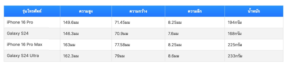 เว็บไซต์ Phonearena แชร์คอนเซ็ปต์ iPhone 16 Pro, iPhone 16 Pro Max, Galaxy S24 และ Galaxy S24 Ultra เพื่อแสดงให้เห็นว่า เมื่อนำมาวางคู่กัน จะมีขนาดแตกต่างกันอย่างไร พร้อมระบุขนาดตัวเครื่องและน้ำหนักไว้อย่างชัดเจน ตามตารางด้านล่าง