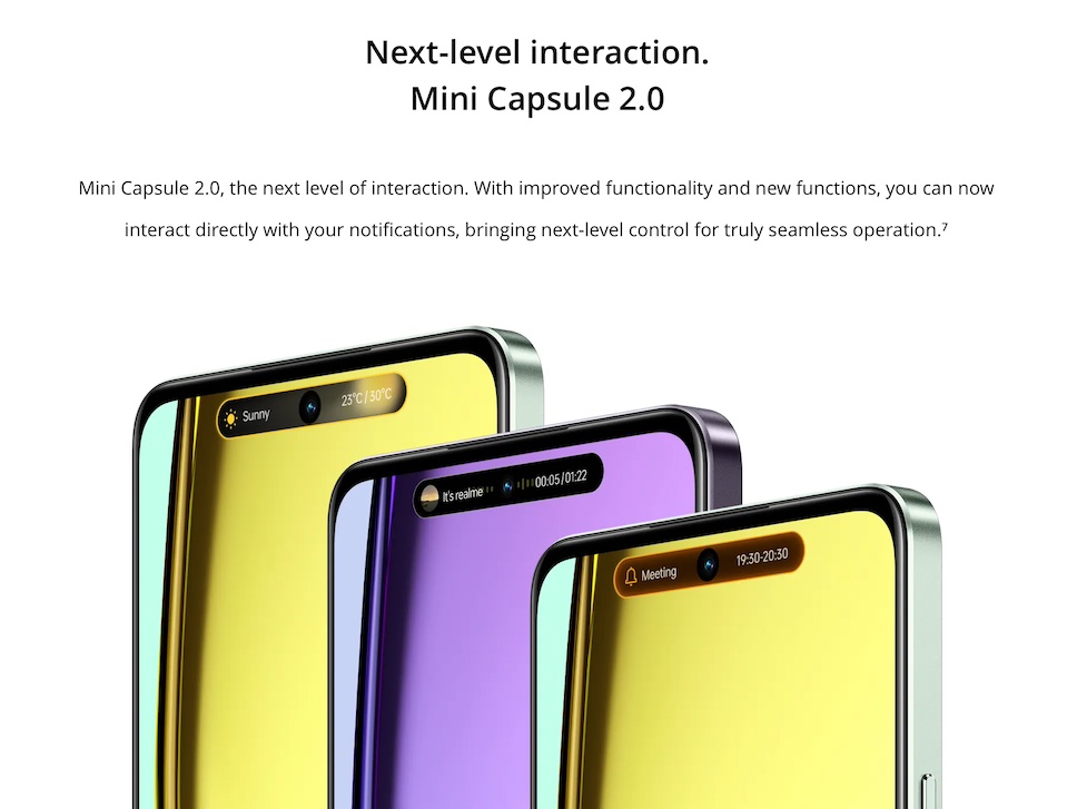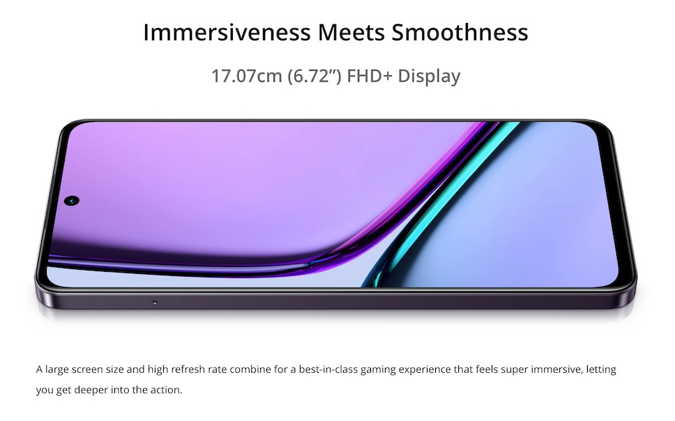 realme C67 5G มาพร้อมจอแสดงผล Full HD+ ขนาด 6.72 นิ้ว ให้ความสว่างสูงสุด 680 นิต รองรับอัตราการรีเฟรชแบบปรับได้สูงสุด 120Hz โดยมีการเจาะหลุมไว้บนหน้าจอสำหรับติดตั้งกล้องหน้า และใช้เป็นพื้นที่โต้ตอบสำหรับฟีเจอร์ Mini Capsule 2.0