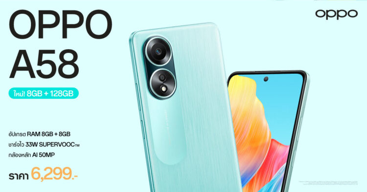 OPPO A58 รุ่น 8GB+128GB สวยโดดเด่นด้วยดีไซน์สวยสะดุดตา มาพร้อม 2 สีสุดเก๋ ได้แก่ สีเขียว Dazzling Green และ สีดำ Glowing Black วางจำหน่ายในราคา 6,299 บาท สามารถไปทดลองสัมผัสหรือเป็นเจ้าของได้แล้ววันนี้ ณ OPPO Brand Shop ทุกสาขา และตัวแทนจำหน่ายทั่วประเทศ