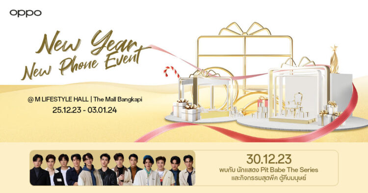 OPPO ฉลองความสุขส่งท้ายปี มอบของขวัญให้แฟนๆ ด้วยการจัดงาน New Year New Phone Event พร้อมมอบความสุขที่เลือกได้ส่งท้ายปี ผ่านโปรโมชันแคมเปญ New Year New Phone ที่ขนสมาร์ตโฟนและอุปกรณ์ IoT กันมาแบบฉ่ำ ทั้งลดและแถม พร้อมให้แฟนออปโป้ได้ไปทดลองสัมผัสหาซื้อสมาร์ตโฟนใหม่ที่มาพร้อมของแถม และข้อเสนอพิเศษอีกมากมาย ที่ M LIFESTYLE HALL ชั้น G ศูนย์การค้าเดอะมอลล์ไลฟ์สโตร์ บางกะปิ ตั้งแต่วันที่ 25 ธันวาคม – 3 มกราคม 2567