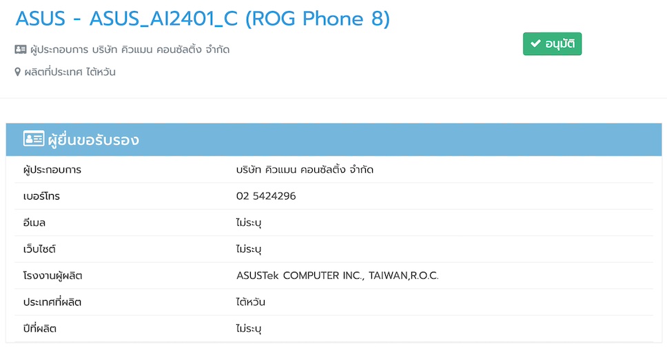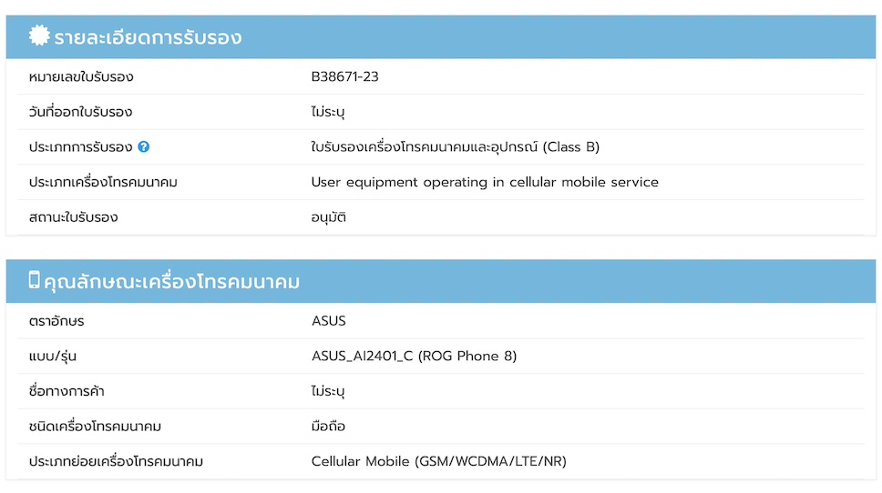 กสทช. ไม่ได้เปิดเผยสเปกให้ทราบ แต่ระบุว่า ROG Phone 8 ในไทย มีหมายเลขรุ่น ASUS_AI2401_C รองรับ 5G / LTE / WCDMA / GSM