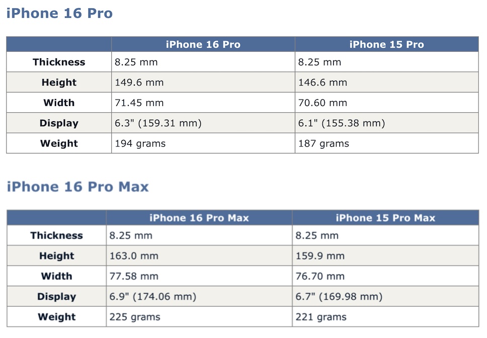 Apple ไม่มีการเปลี่ยนแปลงขนาดจอแสดงผลของ iPhone นับตั้งแต่ iPhone 12 ในปี 2020 แต่มีข่าวลือว่าจะเกิดการเปลี่ยนแปลงกับ iPhone 16 Pro และ iPhone 16 Pro Max ในปี 2024 ซึ่งนั่นทำให้ขนาดตัวเครื่องและน้ำหนัก แตกต่างไปจาก iPhone 15 Pro และ iPhone 15 Pro Max