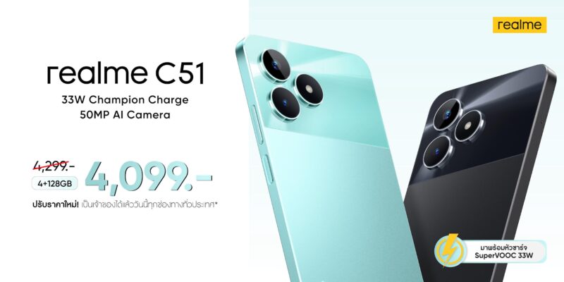 รีบด่วน! เป็นเจ้าของ realme C51 รุ่น 4/128GB ราคาใหม่สุดคุ้ม 4,099 บาทได้แล้ววันนี้ที่ realme Brand Shop ศูนย์จำหน่ายสมาร์ตโฟนชั้นนำทั่วประเทศ และช่องทางออนไลน์ทุกแพลตฟอร์ม ทั้ง Shopee: realme official store, Lazada: realme flagship store และ Tiktok: realme official พบกับโปรโมชันปัง ๆ อีกมากมาย เพียงติดตามเฟซบุ๊ก realme TH https://www.facebook.com/realmeTH