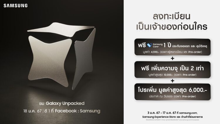 ยิ่งไปกว่านั้นลงทะเบียนรับโค้ดสิทธิพิเศษ ฟรี! เพื่อรับ The new Galaxy สุดล้ำนี้เป็นกลุ่มแรกของโลก และสิทธิพิเศษ 3 ต่อ คือ ฟรี Samsung Care+ 1 ปี ประกันจอแตกและอุบัติเหตุ มูลค่า 4,590 บาท และ ฟรีความจุเพิ่มเป็น 2 เท่า มูลค่าสูงสุด 10,000 บาท อีกทั้งยังมีโปรเพิ่ม ประกาศ ณ วันจอง มูลค่าสูงสุด 6,000 บาท เมื่อนำโค้ดที่ได้รับจากการลงทะเบียนไปจองในช่วงพรีออเดอร์เท่านั้น ลงทะเบียนได้แล้วที่ https://smsng.store/hr-pr ตั้งแต่วันนี้ถึง 17 มกราคม 2567 เท่านั้น