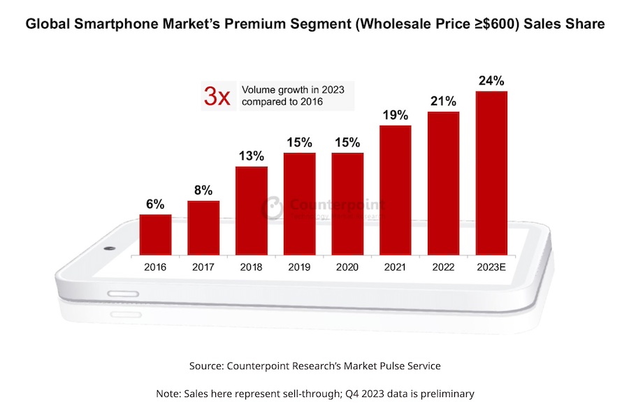 ข้อมูลจาก Counterpoint Research พบว่าตลาดสมาร์ตโฟนระดับพรีเมียมยังคงเติบโตขึ้นอย่างต่อเนื่อง โดยในปี 2023 เติบโตขึ้น 6% เมื่อเทียบกับปีก่อน และเติบโตมากขึ้น 3 เท่า เมื่อเทียบกับปี 2016