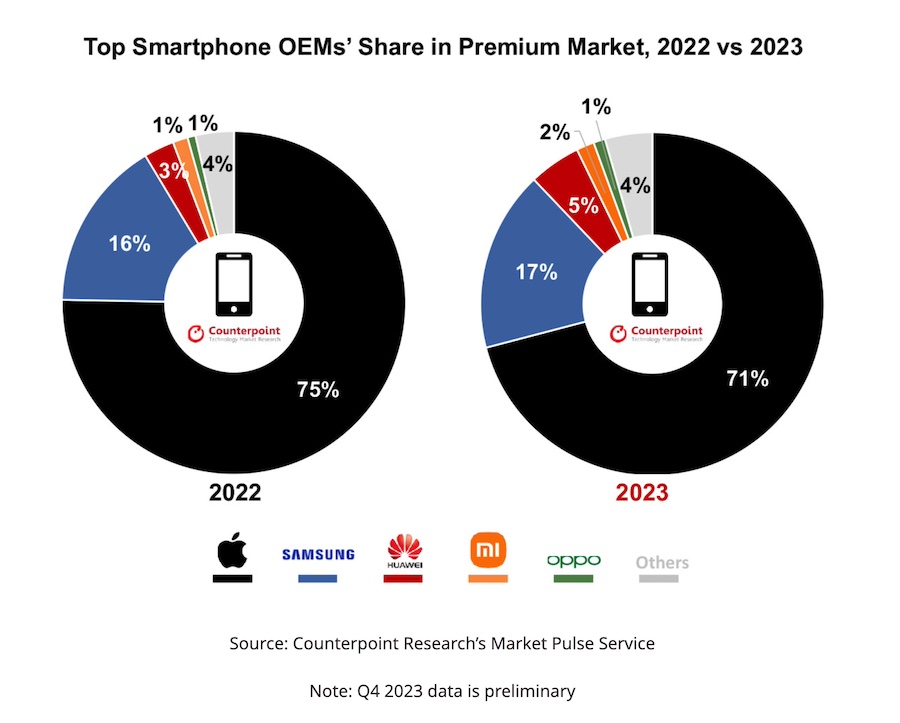 สำหรับผู้นำกลุ่มในตลาดสมาร์ตโฟนระดับพรีเมียม ยังคงเป็น Apple ที่มีส่วนแบ่ง 71% จากยอดขายที่มากกว่าอันดับ 2 อย่าง Samsung ถึง 4 เท่า แต่ Samsung ก็สามารถลดช่องว่างได้เล็กน้อยเมื่อเทียบกับปีก่อน โดยได้รับแรงหนุนจากยอดขาย Galaxy S23 Series และอุปกรณ์แบบพับได้ที่ประสบความสำเร็จ ขณะที่ Huawei ได้กลุ่มผลิตภัณฑ์ Mate 60 Series ที่ขายดีในประเทศจีน ช่วยให้มีส่วนแบ่งเพิ่มขึ้นเมื่อเทียบกับปีที่แล้ว