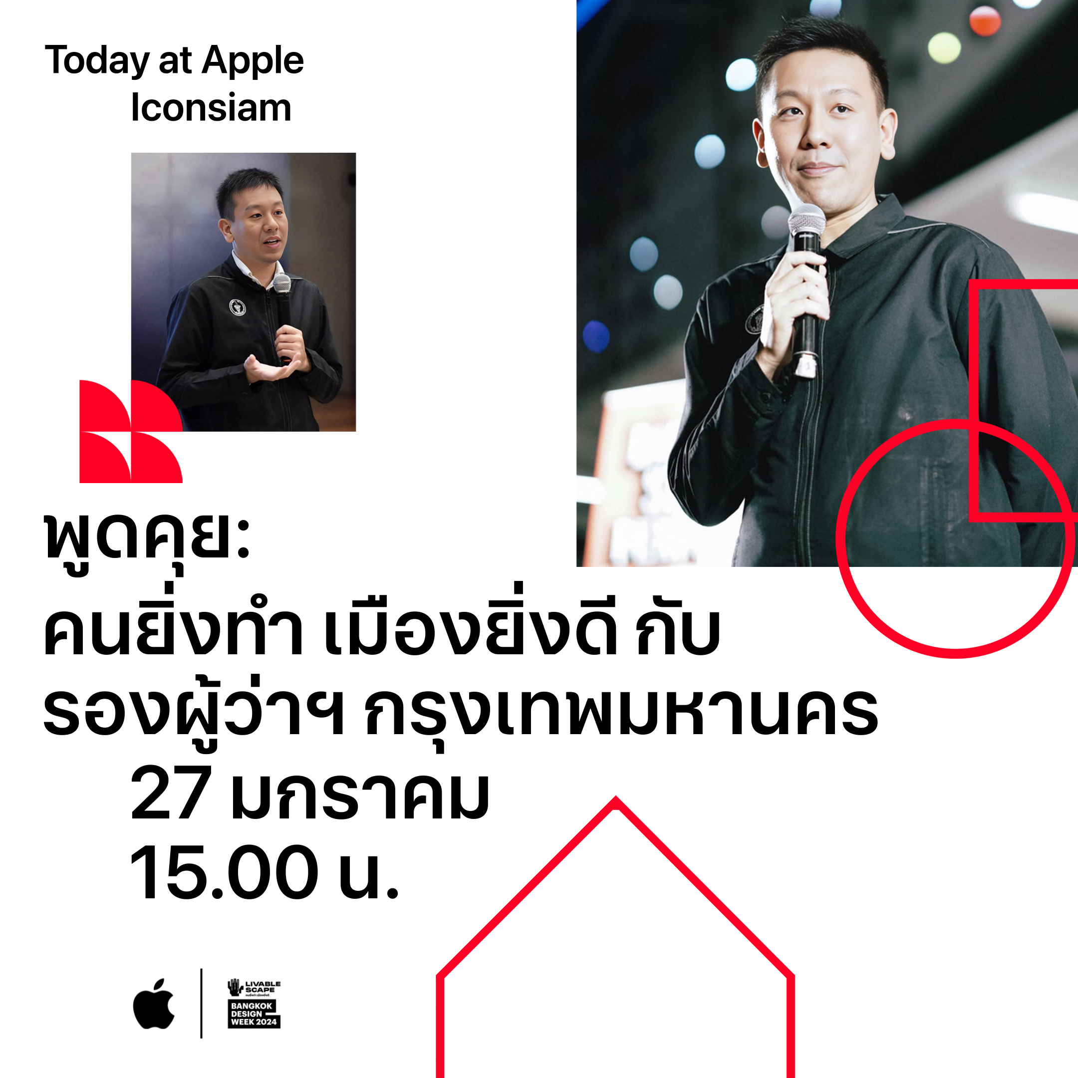 Apple Iconsiam วันเสาร์ที่ 27 มกราคม 202415.00 – 16.00 น.พูดคุย: คนยิ่งทำเมืองยิ่งดีกับรองผู้ว่าฯกรุงเทพมหานครศานนท์หวังสร้างบุญมาร่วมจุดประกายไอเดียใหม่ๆ เพื่อออกแบบกรุงเทพฯ ให้เป็น “เมืองน่าอยู่” กับท่านรองผู้ว่าฯ ศานนท์ หวังสร้างบุญ ที่จะพาทุกคนไปดูการออกแบบต่างๆ ที่จะช่วยพลิกฟื้นย่านเก่าควบคู่ไปกับการพัฒนาคุณภาพชีวิต ผ่านการร่วมคิดร่วมสร้างของผู้คนในชุมชน พร้อมแลกเปลี่ยนมุมมองที่เราสามารถลงมือทำ เพื่อขับเคลื่อนเมืองนี้ให้ดีขึ้นอย่างสร้างสรรค์สำหรับทุกคน เลงทะเบียนเข้าร่วมฟรีได้ที่ https://apple.co/bkkdw24-1