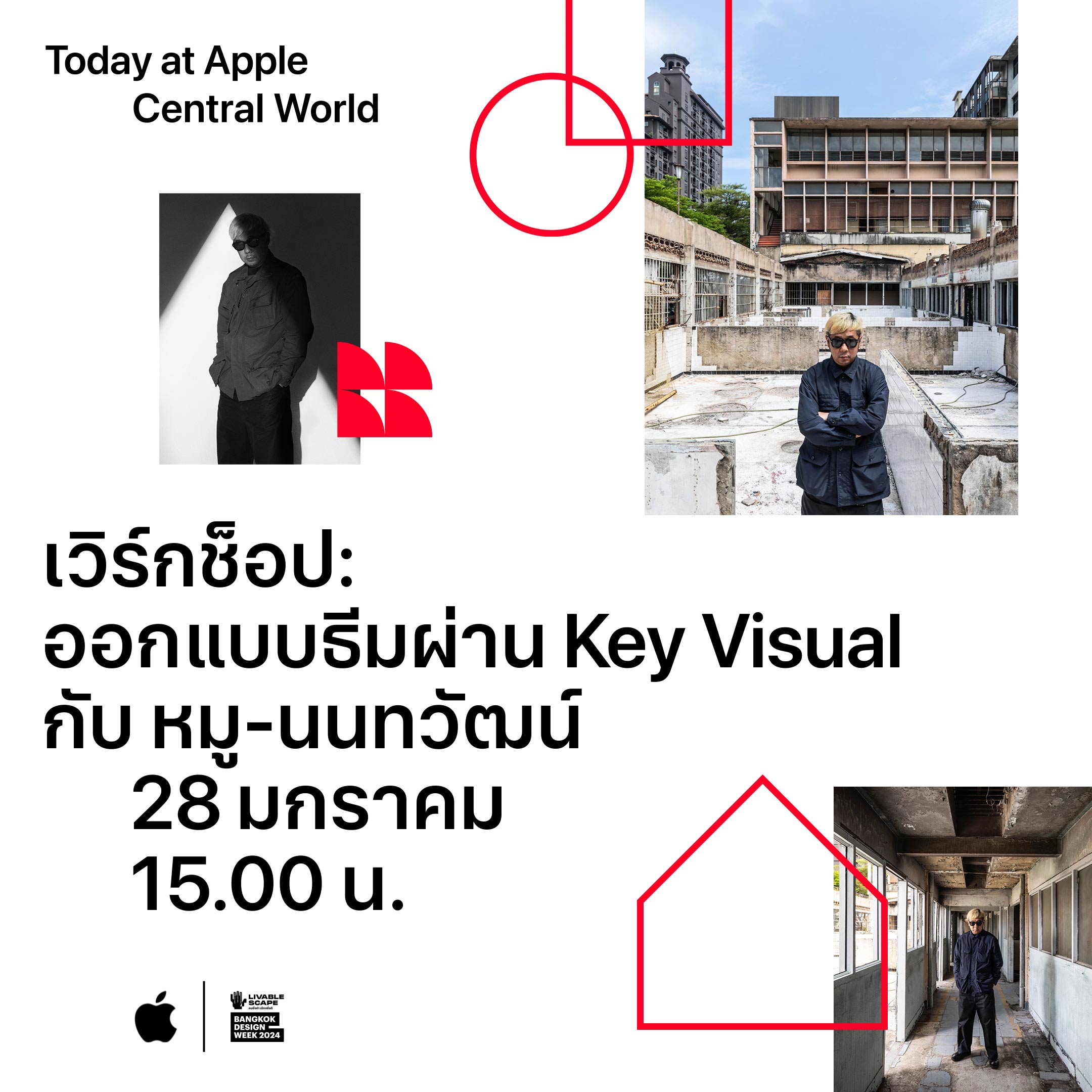Apple Central World อาทิตย์ที่ 28 มกราคม 202415.00 – 16.30 น.เวิร์กช็อป: ออกแบบธีมผ่าน Key Visual กับหมู–นนทวัฒน์ไขกุญแจสู่พลังแห่งภาษาภาพด้วย Key Visual กับ หมู-นนทวัฒน์ ที่จะชวนคุณไปเรียนรู้ความสำคัญและบทบาทของ Key Visual รวมถึงเทคนิคออกแบบตัวอักษร ทฤษฎีสี และการวางโลโก้ เพื่อสื่อสารธีมให้เป็นภาพจำติดตาตรึงใจ ก่อนจะไปตีโจทย์คอนเซ็ปต์ “กรุงเทพฯ เมืองน่าอยู่” แล้วลงมือสร้างสรรค์ Key Visual ของตัวคุณเอง โดยใช้ Procreate บน iPad และ Apple Pencil ลงทะเบียนเข้าร่วมฟรีได้ที่ https://apple.co/bkkdw24-2