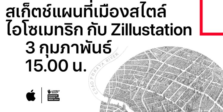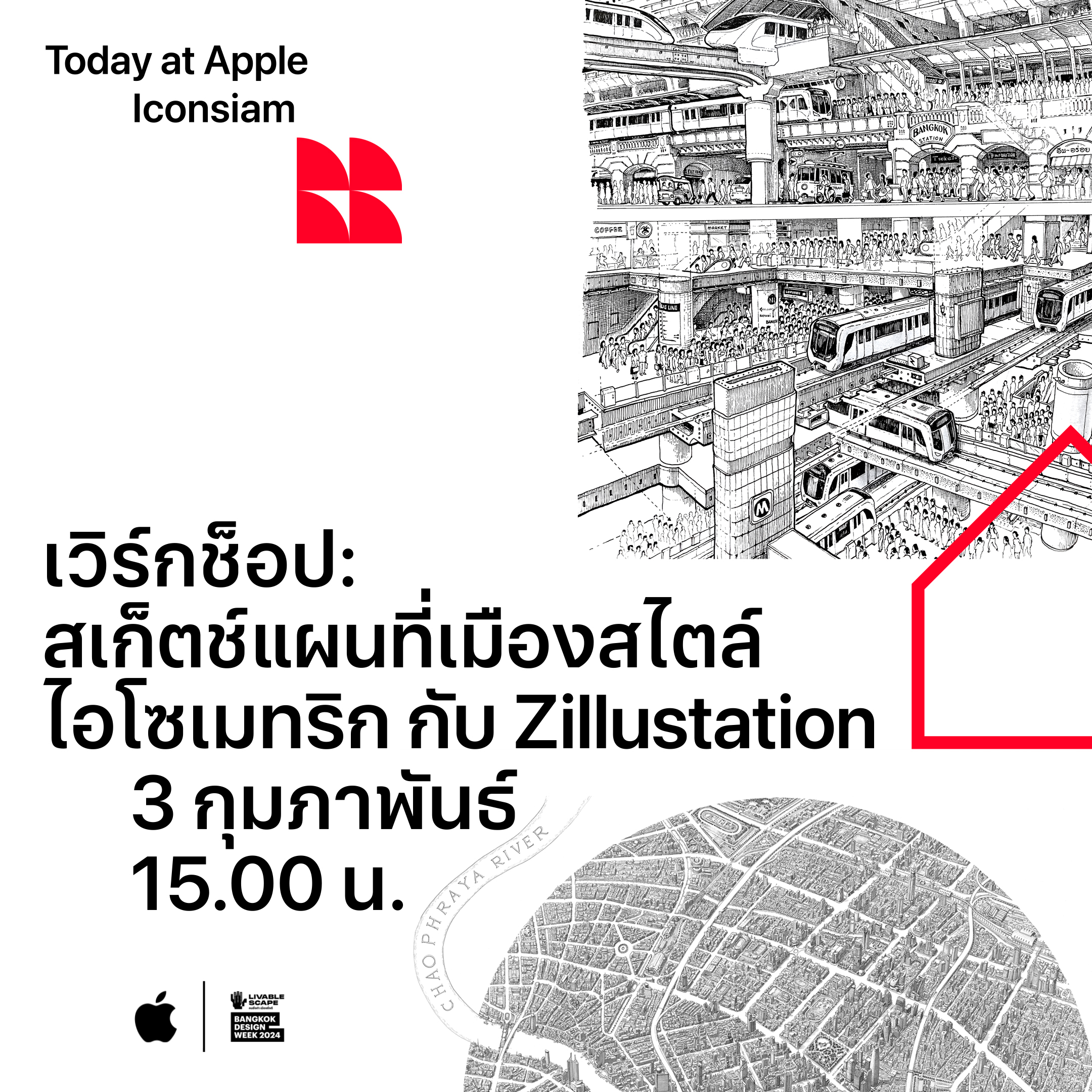 Apple Iconsiam วันเสาร์ที่ 3 กุมภาพันธ์ 202415.00 – 16.30 น.เวิร์กช็อป: สเก็ตช์แผนที่เมืองสไตล์ไอโซเมทริกกับ Zillustationเปลี่ยนกรุงเทพฯ ในความทรงจำให้เป็นลายเส้นแผนที่สไตล์ไอโซเมทริก กับ Zillustation นักวาดสายแลนด์สเคป ที่จะพาคุณไปสำรวจกรุงเทพฯ ในภาพวาดแผนที่ที่โดดเด่นด้วยรายละเอียด พร้อมเรียนรู้กระบวนการสังเกตรูปร่าง เส้นสาย และแสงเงา อันเป็นเอกลักษณ์ของอาคารต่างๆ จากนั้นลองลงมือสเก็ตช์ภาพย่านโปรดในใจคุณ ด้วยแอป Procreate บน iPad Pro และ Apple Pencil เลงทะเบียนเข้าร่วมฟรีได้ที่ https://apple.co/bkkdw24-3