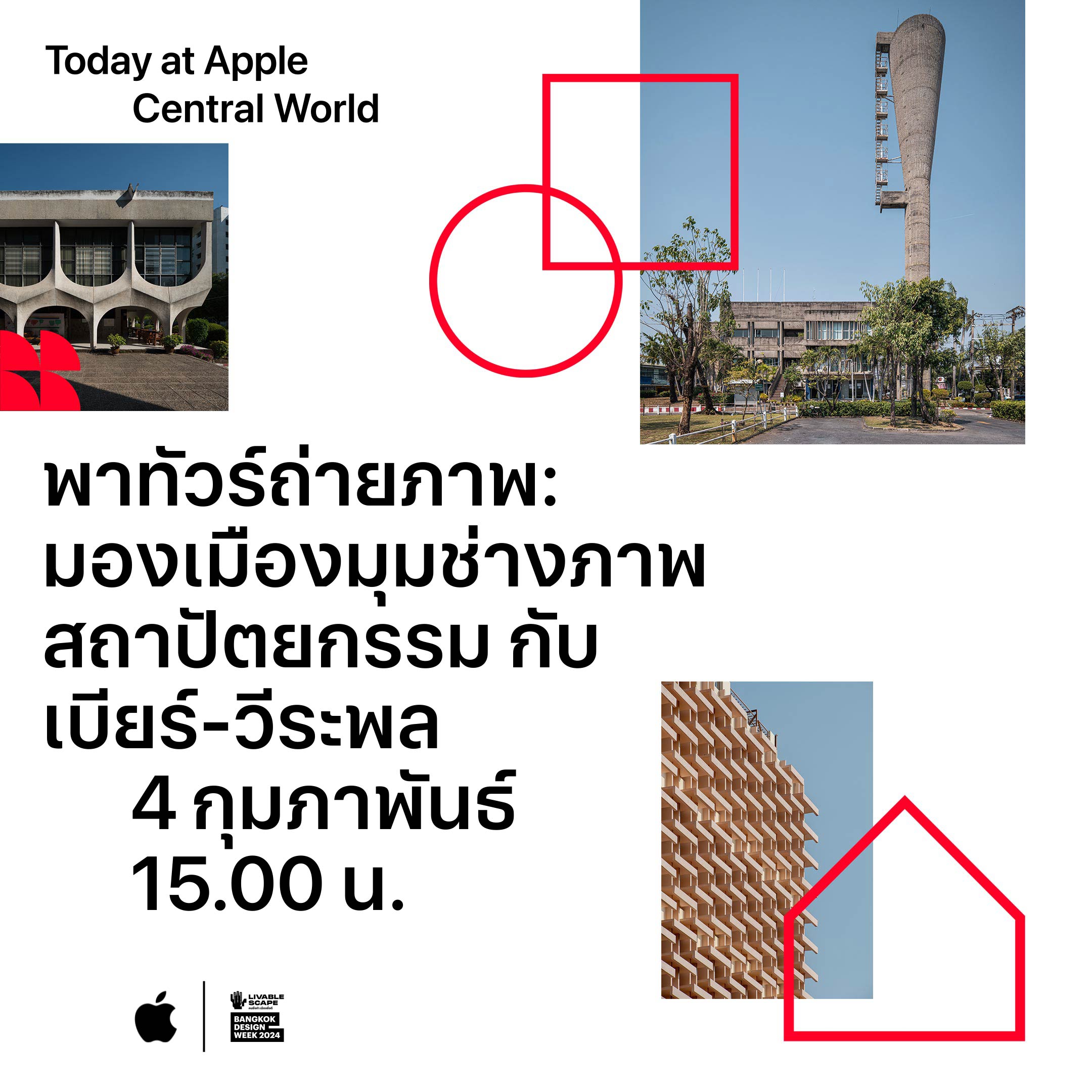 Apple Central World วันอาทิตย์ที่ 4 กุมภาพันธ์ 202415.00 – 17.00 น.พาทัวร์ถ่ายภาพ: มองเมืองมุมช่างภาพสถาปัตยกรรมกับเบียร์–วีระพลออกสำรวจกรุงเทพฯ ที่คุ้นตาในมุมที่ไม่คุ้นเคย กับ เบียร์-วีระพล สิงห์น้อย ช่างภาพชื่อดัง ที่จะพาคุณไปค้นหาความน่าสนใจที่แฝงอยู่ในเส้นสายและเหลี่ยมมุมของกลุ่มอาคารใจกลางมหานคร พร้อมเรียนรู้เทคนิคการถ่ายภาพสถาปัตยกรรม ทั้งการจัดองค์ประกอบ การเล่นแสงเงา รวมถึงการขับรายละเอียดให้โดดเด่นในแบบที่คมชัดสุดๆ ด้วยคุณสมบัติของกล้องบน iPhone 15 Pro เลงทะเบียนเข้าร่วมฟรีได้ที่ https://apple.co/bkkdw24-4