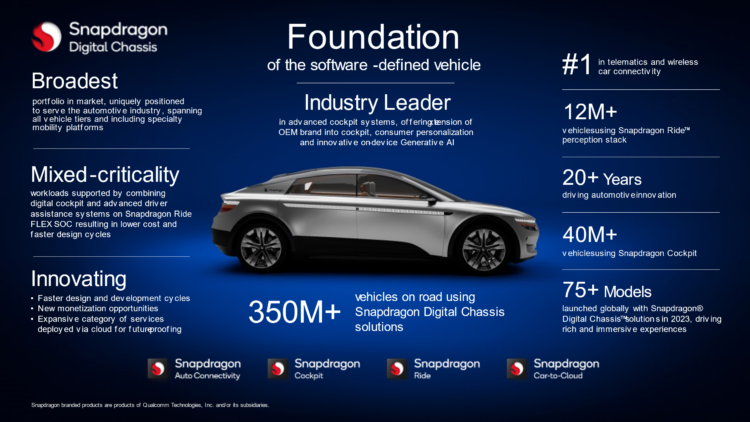 “ควอลคอมม์ เทคโนโลยีส์เป็นพันธมิตรที่อุตสาหกรรมยานยนต์ไว้วางใจมานานกว่าสองทศวรรษ เราส่งมอบนวัตกรรมและแพลตฟอร์มอันเป็นที่ยอมรับผ่าน Snapdragon Digital Chassis เพื่อกำหนดนิยามใหม่สำหรับรถยนต์” Nakul Duggal รองประธานอาวุโสและผู้จัดการทั่วไป ฝ่ายยานยนต์และการประมวลผลแบบคลาวด์ บริษัท ควอลคอมม์ เทคโนโลยีส์ อินคอร์ปอเรชั่น กล่าว โดยเสริมว่า “ความมุ่งมั่นของเราในการพัฒนาเทคโนโลยีรถยนต์เพื่อสนับสนุนผู้ผลิตรถยนต์ระดับโลก ซัพพลายเออร์แนวหน้าและพันธมิตรในระบบนิเวศ และกำลังนำทางเข้าสู่อนาคตของยานยนต์ที่ขับเคลื่อนด้วยซอฟต์แวร์ และยุคใหม่ของอุตสาหกรรมยานยนต์”