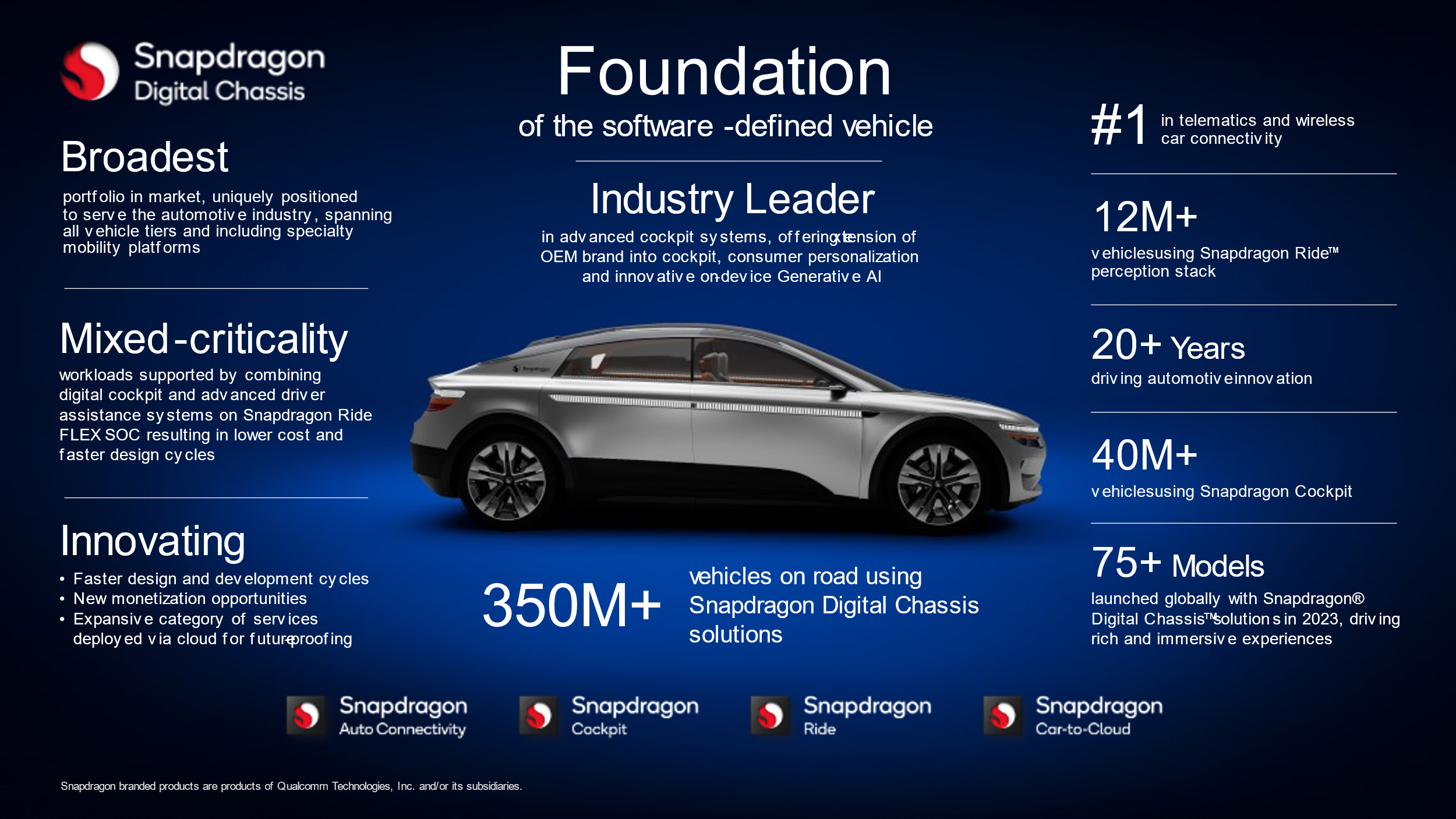 ควอลคอมม์ เทคโนโลยีส์มีกลุ่มผลิตภัณฑ์เทคโนโลยียานยนต์ที่กว้างขวางที่สุด ครอบคลุมทุกโดเมนหลักของยานพาหนะ และยังคงขยายพอร์ตโฟลิโออย่างต่อเนื่องเพื่อเป็นผู้นำนวัตกรรม รวมถึงการสนับสนุนรถสองล้อและกลุ่มไมโครโมบิลิตี้ (Micro Mobility) บริษัทฯ ได้ดำเนินกิจการเข้าสู่ปีที่ 20 ในการจัดหาเทคโนโลยีให้กับอุตสาหกรรมยานยนต์ โดยมีรายได้เติบโตสองหลักเมื่อเทียบเป็นรายปี อันเป็นผลมาจากการใช้งานที่เพิ่มขึ้นของโซลูชัน Snapdragon Digital Chassis ซึ่งรองรับด้วยคุณสมบัติดังต่อไปนี้