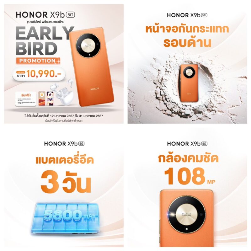 สำหรับ HONOR X9b เป็นสมาร์ตโฟนระดับกลางรุ่นใหม่ล่าสุดในกลุ่ม X Series ที่เต็มไปด้วยคุณภาพ เน้นเจาะกลุ่มผู้ชายวัยรุ่น วัยทำงาน ที่ต้องการมือถือแข็งแรง ทนทาน สำหรับไว้ใช้งานในระยะยาว โดยรุ่นนี้มาพร้อมกับสโลแกน “ขุมพลังใหม่ พร้อมชนรอบด้าน – All Angle Ultra Tough” ชูจุดเด่น 3 หัวใจหลัก ดังนี้