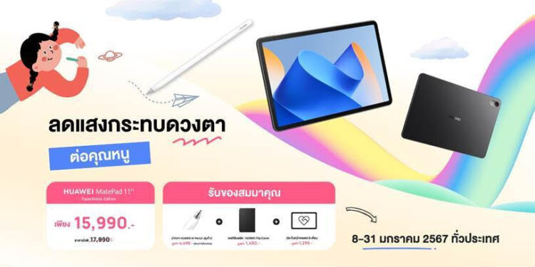 หัวเว่ย คอนซูมเมอร์ บิสสิเนส กรุ๊ป (ประเทศไทย) มอบของขวัญเอาใจวันเด็กกับแท็บเล็ตถนอมสายตา HUAWEI MatePad 11” PaperMatte Edition ที่คุณพ่อคุณแม่วางใจด้วยเทคโนโลยีป้องกันแสงสะท้อนปลอดภัยต่อสายตา มาพร้อมกับโปรโมชันส่วนลดพิเศษ 2,000 บาท เหลือเพียง 15,990 จากราคาปกติ 17,990 พร้อมรับฟรี ปากกา HUAWEI-M Pencil รุ่นที่ 2 มูลค่า 4,490 บาท (แถมมาในกล่อง) HUAWEI Flip Cover มูลค่า 1,490 บาท และการดูแลหน้าจอ 6 เดือน มูลค่า 1,299 บาท ตั้งแต่วันที่ 8 มกราคม 2567 ถึง 31 มกราคม 2567