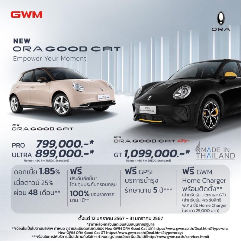 เกรท วอลล์ มอเตอร์ กลับมาปลุกกระแสรถยนต์พลังงานไฟฟ้าในประเทศไทยอีกครั้ง เปิดตัวและประกาศราคาNew GWM ORA Good Cat จากสายการผลิตในไทยอย่างเป็นทางการ โดย New GWM ORA Good Cat มาพร้อมกับ 3 รุ่นย่อย รุ่น PRO ราคา 799,000 บาท รุ่น ULTRA ราคา 899,000 บาท และ GT ราคา 1,099,000 บาท ตอกย้ำความมุ่งมั่นส่งมอบผลิตภัณฑ์ที่มีคุณภาพและเทคโนโลยีอันล้ำสมัย ด้วยรถยนต์ไฟฟ้า 100% ส่งเสริมการขับขี่ที่เป็นมิตรต่อสิ่งแวดล้อม พร้อมส่งมอบภายในเดือนมกราคม 2567 นี้ แฟน ๆ ชาวไทยที่สนใจสามารถจับจองเป็นจ้าของได้ที่ GWM application และเว็บไซต์ www.gwm.co.th ได้ตั้งแต่วันที่ 12 มกราคม 2567 เวลา 11.00 น. เป็นต้นไป