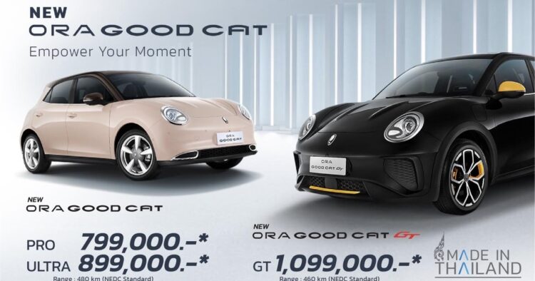 New GWM ORA Good Cat รุ่นสายการผลิตในประเทศไทย ถือกำเนิดขึ้นเพื่อสร้างกระแสความนิยมในหมู่ผู้บริโภคยุคใหม่ มาพร้อมกับ 3 รุ่นย่อย รุ่น PRO และ รุ่น ULTRA ขับเคลื่อนด้วยมอเตอร์ไฟฟ้า ให้กำลังสูงสุด 105 กิโลวัตต์ หรือ 143 แรงม้า แรงบิดสูงสุด 210 นิวตัน-เมตร สามารถวิ่งได้ 480 กิโลเมตรต่อการชาร์จหนึ่งครั้ง (มาตรฐาน NEDC) และรุ่น GT เอาใจสายสปอร์ต มีพละกำลังสูงสุด 126 กิโลวัตต์ หรือ 171 แรงม้า แรงบิดสูงสุด 250 นิวตัน-เมตร วิ่งได้ 460 กิโลเมตรต่อการชาร์จหนึ่งครั้ง (มาตรฐาน NEDC)