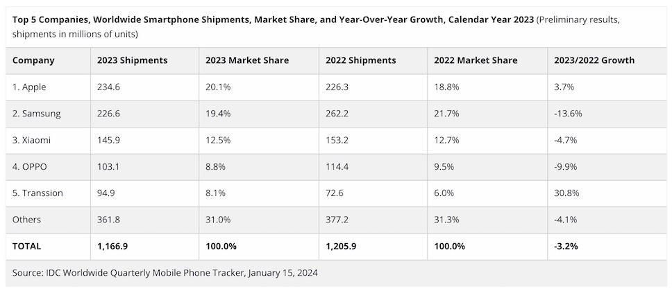 ข้อมูลล่าสุดจาก IDC พบว่าตลอดทั้งปีที่ผ่านมา Apple มียอดจัดส่ง iPhone ทั้งหมด 234.6 ล้านเครื่อง เติบโตขึ้น 3.7% เมื่อเทียบกับปี 2022 และครองส่วนแบ่งในตลาดมากที่สุด 20.1%