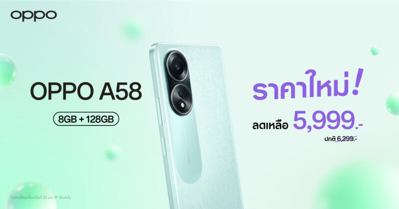 “OPPO A58 รุ่น 8+128GB” สมาร์ตโฟนให้คุณใช้งานได้เต็มพิกัด ทุกความบันเทิง ตอบโจทย์ทุกเอ็นเตอร์เทน ไม่ว่าจะดูหนัง ฟังเพลงหรือเล่นเกมก็ใช้งานได้อย่างลื่นไหล มาพร้อมราคาใหม่สุดพิเศษเพียง 5,999 บาท จากราคาปกติ 6,299 บาท ตั้งแต่วันที่ 22 มกราคม 2567 เป็นต้นไป