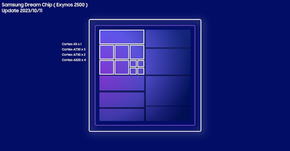 CPU ของ Exynos 2500 จะประกอบด้วย Cortex-X5 (Single Core) ความเร็วสูงสุด 3.2GHz หรือมากกว่า, Cortex-A730 (3-core) ความเร็ว 2.3 – 2.5GHz, Cortex-A730 (2-core) และ Cortex-A520 (4-core)