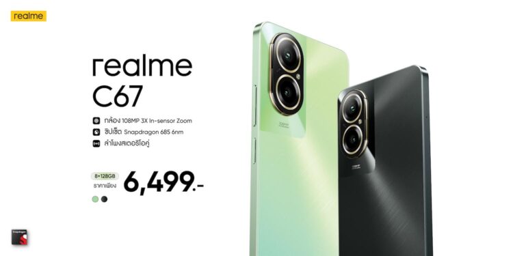 realme (เรียลมี) แบรนด์สมาร์ตโฟนเพื่อคนรุ่นใหม่ที่เติบโตเร็วที่สุดในโลก เตรียมสร้างมาตรฐานใหม่ในวงการมือถือกลุ่ม Entry-level อีกครั้ง ด้วยแชมป์เปี้ยนสมาร์ตโฟนรุ่นใหม่ล่าสุด “realme C67” เพื่อตอกย้ำว่าเรียลมีเป็นแบรนด์สมาร์ตโฟนที่เข้าใจในทุกไลฟ์สไตล์และตอบโจทย์ในความต้องการของคนรุ่นใหม่ เรียลมีจึงมุ่งมั่นที่จะมอบประสบการณ์การใช้งานที่เหนือขั้นให้กับคนรุ่นใหม่ได้อย่างง่ายดายมากยิ่งขึ้น ในครั้งนี้เรียลมีจึงมาพร้อมเทคโนโลยีระดับไฮเอนด์และฟีเจอร์ต่างๆ ที่ผู้ใช้งานส่วนใหญ่ชื่นชอบและมักจะพบแต่ในสมาร์ตโฟนระดับแฟล็กชิปมาสู่สมาร์ตโฟนระดับเริ่มต้น เพื่อให้ผู้ใช้งานได้สัมผัสกับเทคโนโลยีอันทันสมัยในราคาที่สามารถเอื้อมถึงได้ จึงทำให้ realme C67 มาพร้อมกับกล้อง 108MP พร้อมการซูมเซนเซอร์ 3 เท่าแบบไม่สูญเสียรายละเอียด พร้อมประสิทธิภาพการทำงานเร็วแรงเต็มสปีดด้วยชิปเซ็ต Snapdragon ระดับ 6 นาโนเมตร มอบสุดยอดประสบการณ์มือถือในราคาสุดคุ้มที่ราคา 6,499 บาท (ข้อมูลเพิ่มเติม : https://www.facebook.com/realmeTH/posts/pfbid02RQL119P7eSxt3scpchwtFqckQ8YJLfWZrtUN4xZRwzfcRovyRskqTMpv962dD7WRl)