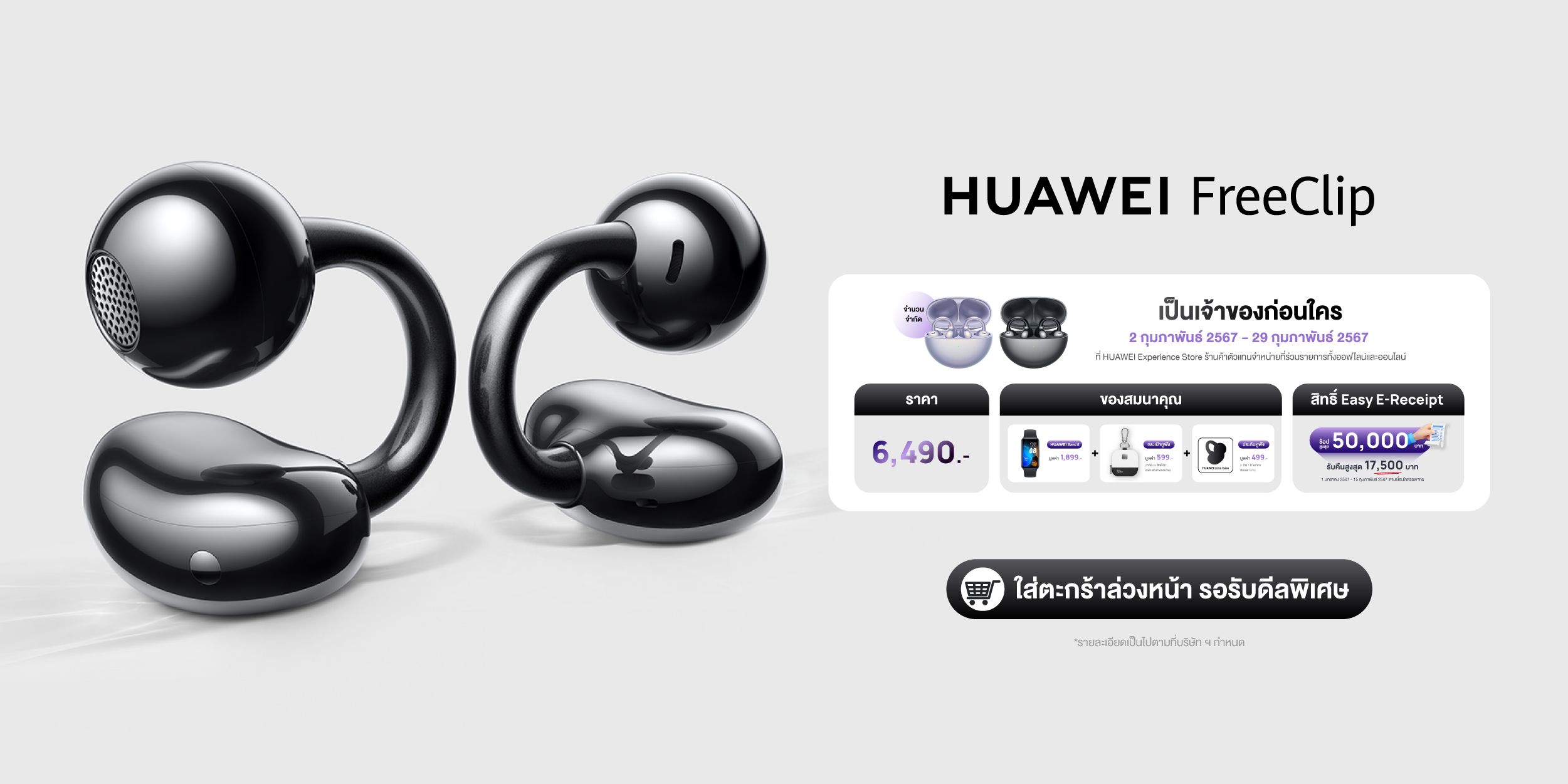 HUAWEI FreeClip วางจำหน่ายในราคา 6,490 บาท มีตัวเลือกสีม่วงล้ำสมัย และสีดำเรียบหรู มาพร้อมเคสชาร์จทรงกลมมนถือถนัดมือ มอบความรู้สึกเรียบง่ายและสะดวกสบาย