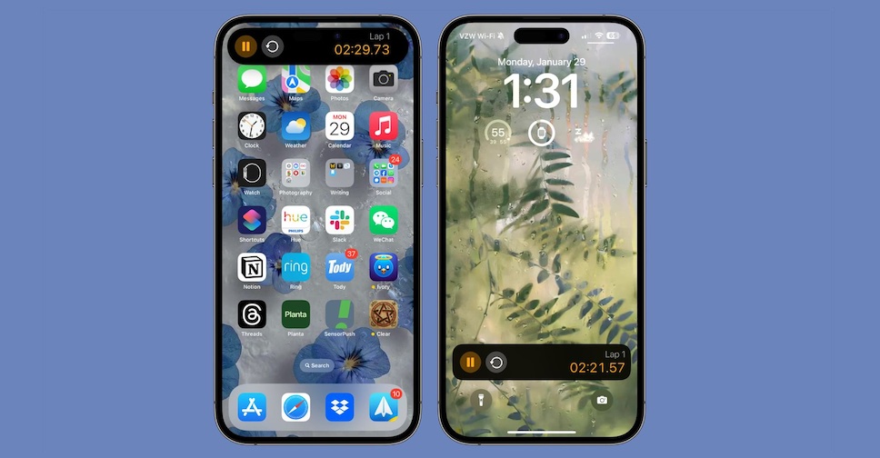เมื่อแตะนาฬิกาจับเวลาบน Dynamic Island จะพบตัวเลือกในการหยุดจับเวลาชั่วคราวหรือเริ่มรอบใหม่ ซึ่งจะพบการควบคุมแบบเดียวกันนี้บนหน้้าจอ Lock Screen ด้วย และสามารถลบนาฬิกาจับเวลาได้ทั้งจากหน้าจอ Lock Screen (ปัดออก) และ Dynamic Island (แตะปุ่ม X)