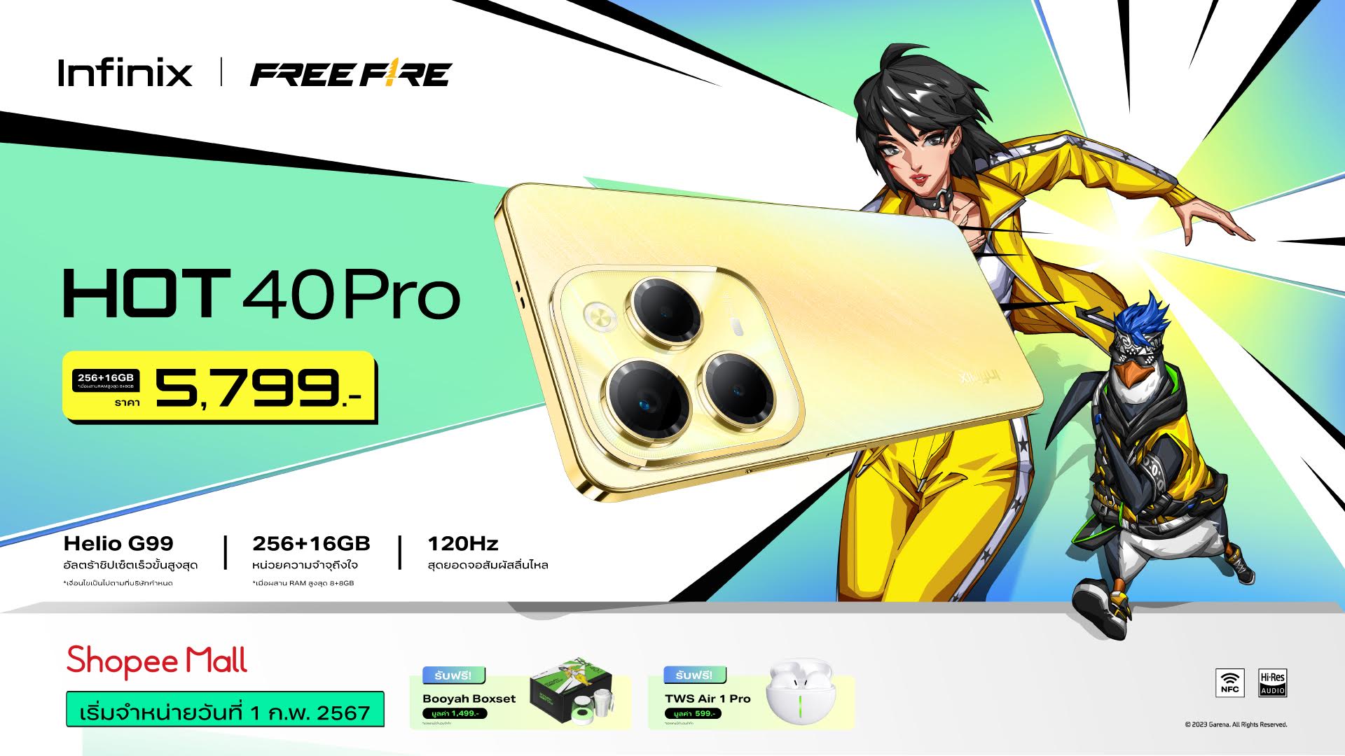 สมาร์ตโฟน HOT 40 Series ถูกออกแบบมาเพื่อมอบประสบการณ์และประสิทธิภาพที่เหนือชั้น ในทุก ๆ วันของการใช้งาน ไม่ว่าจะสายเกมมิ่ง หรือสายบันเทิง ก็ตอบโจทย์ จัดเต็ม อัดแน่นความบันเทิง ในราคาโดนใจสุดคุ้ม สำหรับ “Infinix HOT 40Pro” กับ 4 สีสัน Palm Blue (ฟ้า), Horizon Gold (ทอง), Starlit Black (ดำ), Starfall Green (เขียว) เปิดราคาอยู่ที่ 5,799 บาท และ “Infinix HOT40i” กับสามสีสัน Palm Blue (ฟ้า), Starlit Black (ดำ), Starfall Green (เขียว) ราคา 4,499 บาท เท่านั้น พร้อมวางจำหน่ายอย่างเป็นทางการ ทางออนไลน์ที่ Shopee: https://cutt.ly/bwZcASnv Lazada: https://cutt.ly/zwZcSaeD และ Tiktok Shop: https://cutt.ly/ywZcSbAx. และร้านค้าชั้นนำที่ BaNANA, Jaymart, IT City, TG FONE พร้อมคูปองส่วนลดสุดคุ้มและโปรโมชั่นผ่อน 0% นานสูงสุด 10 เดือน (เงื่อนไขเป็นไปตามบัตรเครดิตที่ร่วมรายการ) และพิเศษรับฟรี Booyah Boxset จำนวนจำกัดกับลำโพงและแก้วน้ำสุดพรีเมี่ยมสำหรับ 450 ออเดอร์แรกที่สั่งซื้อผ่านทาง TikTok Shop และ Shopee Mall พร้อมติดตามโปรโมชั่นได้ที่หน้าร้านทุกสาขาได้ตั้งแต่วันที่ 1 กุมภาพันธ์ 2567 เป็นต้น