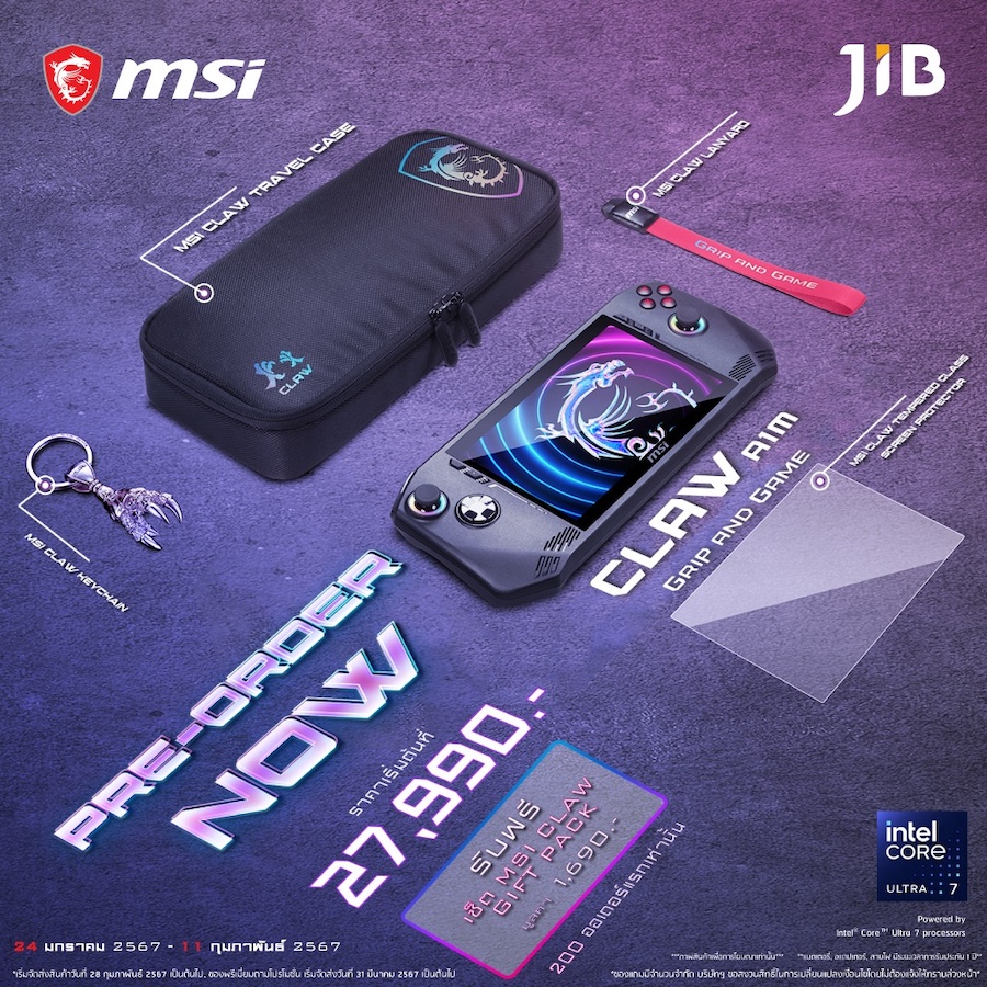 นอกจาก Lenovo Legion Go เกมเมอร์ชาวไทยยังมีอีกตัวเลือกที่น่าสนใจ ได้แก่ ASUS ROG Ally ที่วางจำหน่ายไปก่อนหน้านี้ และล่าสุด MSI Claw ก็เปิดรับจองในไทยแล้ว ตั้งแต่วันนี้ ไปจนถึงวันที่ 11 กุมภาพันธ์ 2567 ราคา 27,990 บาท เริ่มจัดส่งและวางจำหน่ายตั้งแต่วันที่ 28 กุมภาพันธ์ 2567 เป็นต้นไป