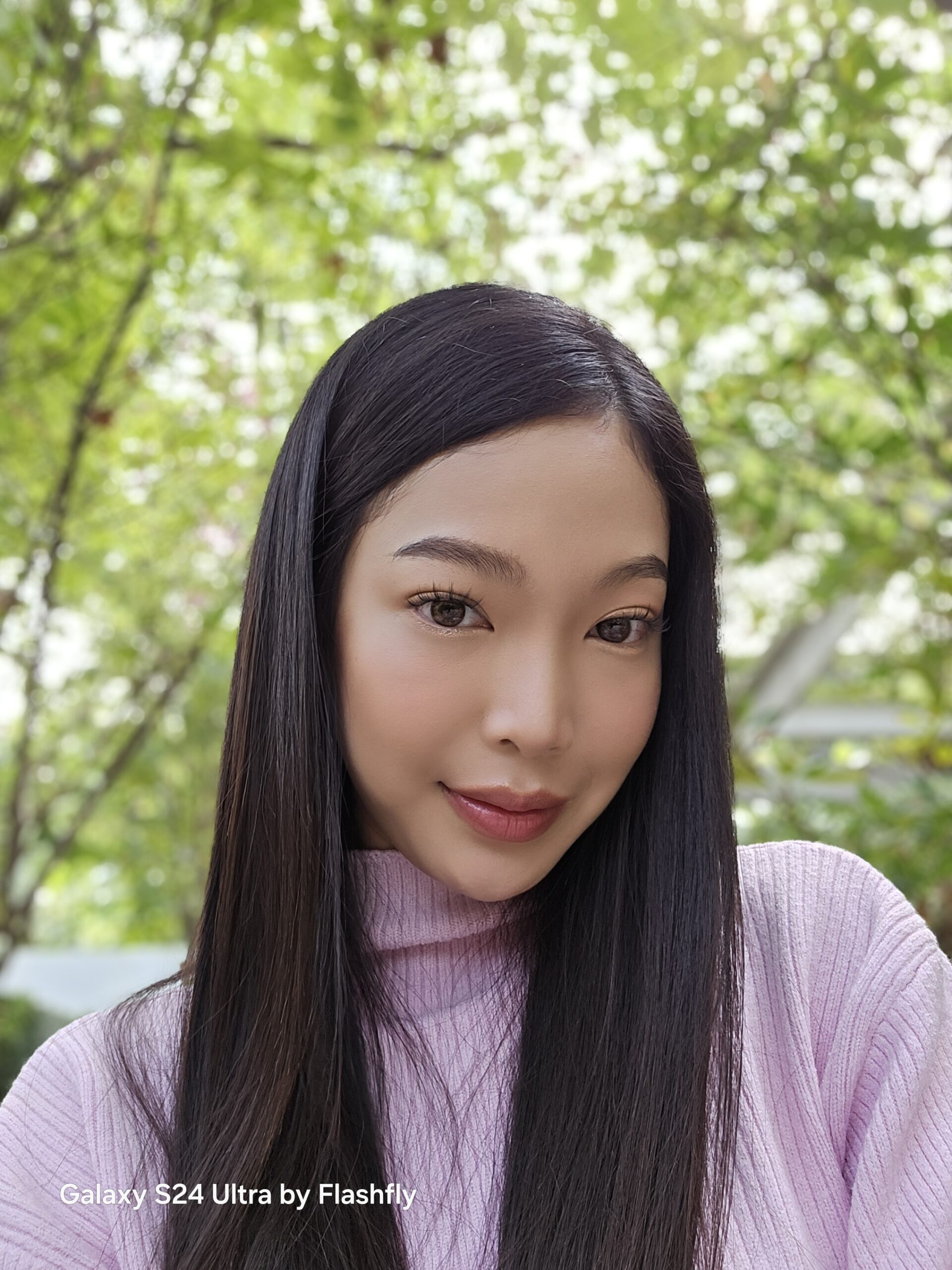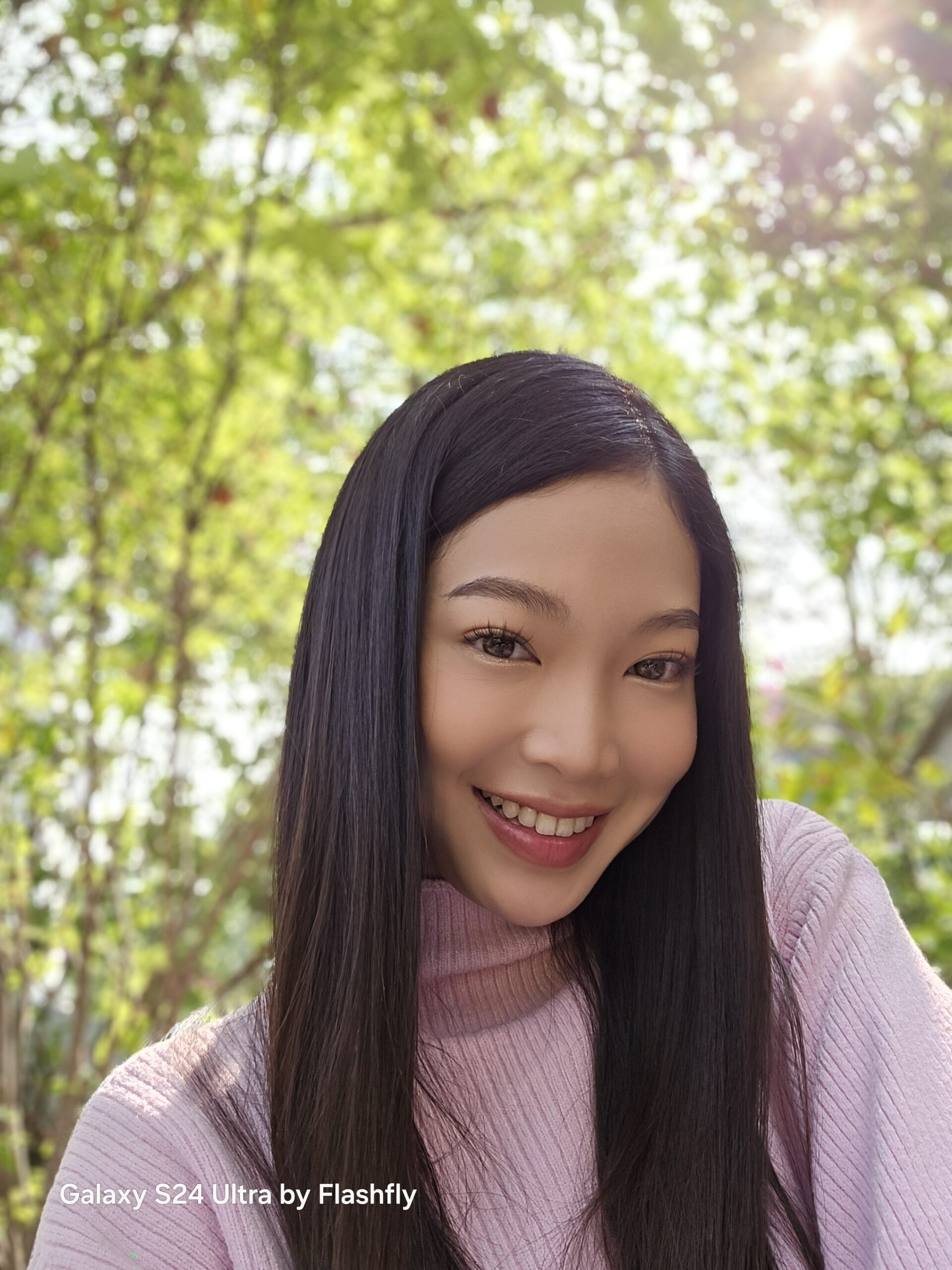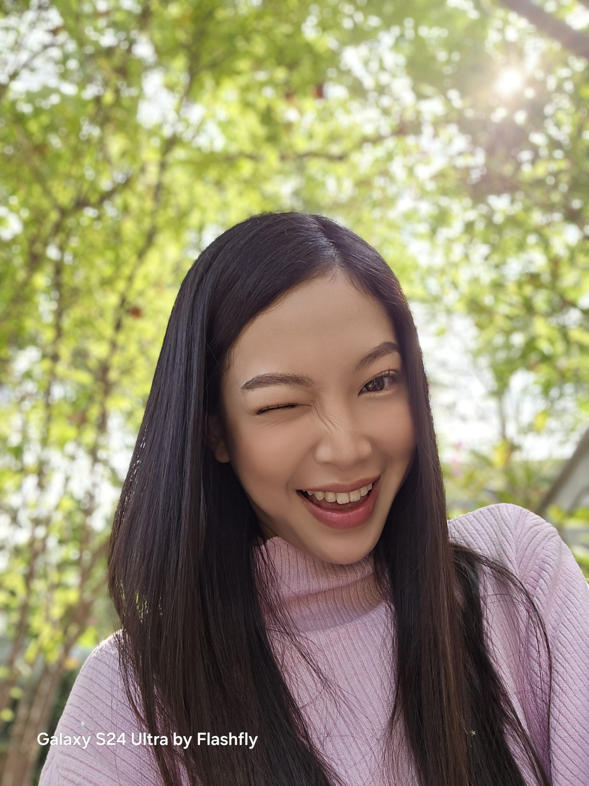 Samsung Galaxy S24 Ultra ติดตั้งกล้องหน้าไว้ในหลุมบนหน้าจอเช่นเดียวกับรุ่นก่อน โดยมีความละเอียด 12 ล้านพิกเซล รูรับแสง F2.2 ให้มุมมองภาพ 80 องศา และแน่นอนว่ามีจุดเด่นในการถ่ายวิดีโอในโหมดบันทึกคู่ เพราะสามารถจับคู่กล้องหลังที่ต้องการได้ เพื่อถ่ายภาพในเฟรมเดียวกัน ไม่ว่าจะเป็นกล้อง Wide, Ultra Wide และ Telephoto