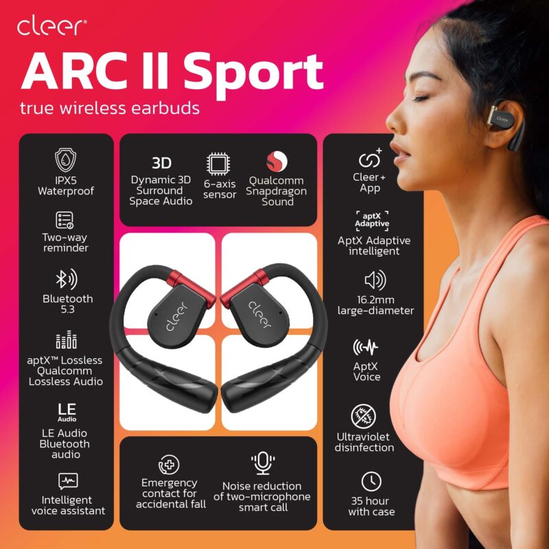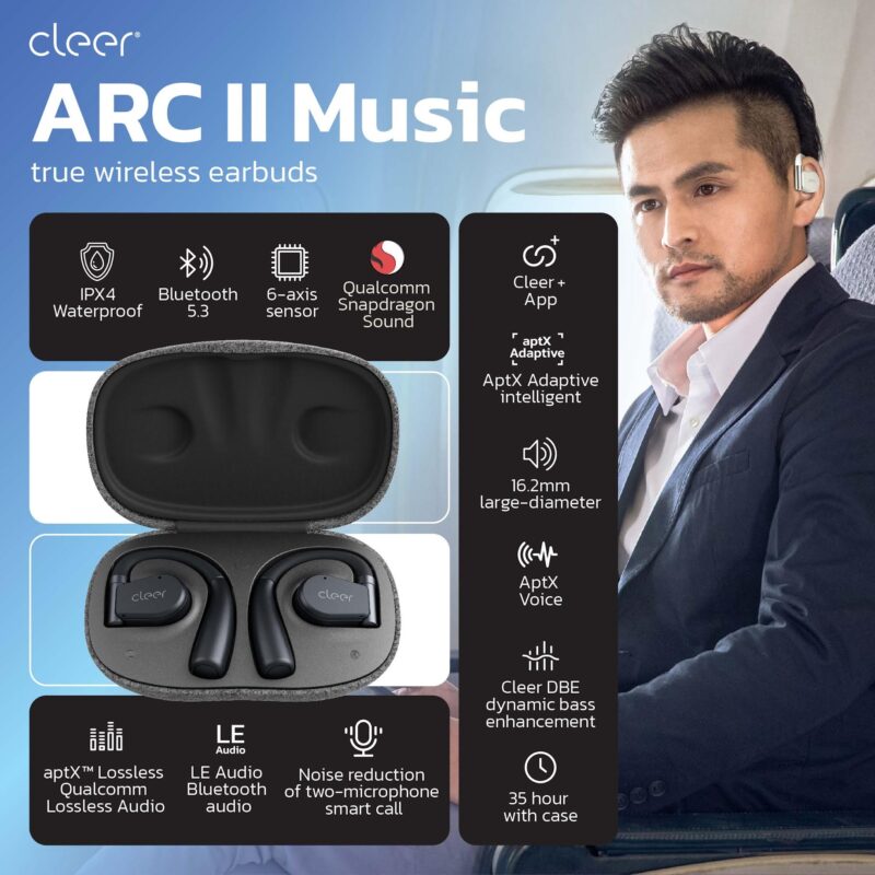 ARC II SPORT เป็นหูฟังไร้สายแบบ Open Ear ที่ออกแบบมาสำหรับคนรักเสียงเพลงที่มีไลฟ์สไตล์แอคทีฟหรือชอบออกกำลังกาย มาพร้อมที่เกี่ยวหูและบานพับที่สามารถปิดพับได้ ช่วยเพิ่มการยึดเกาะให้คุณสวมใส่ได้อย่างสบายและกระชับมากยิ่งขึ้น พร้อมมาตรฐานกันน้ำกันเหงื่อระดับ IPX5 รองรับ Multipoint Connectivity ที่ช่วยให้การเชื่อมต่อ 2 อุปกรณ์พร้อมกันได้อย่างง่ายดายผ่านบลูทูธ และสามารถสลับการใช้งานระหว่างอุปกรณ์ได้อย่างสะดวกสบาย