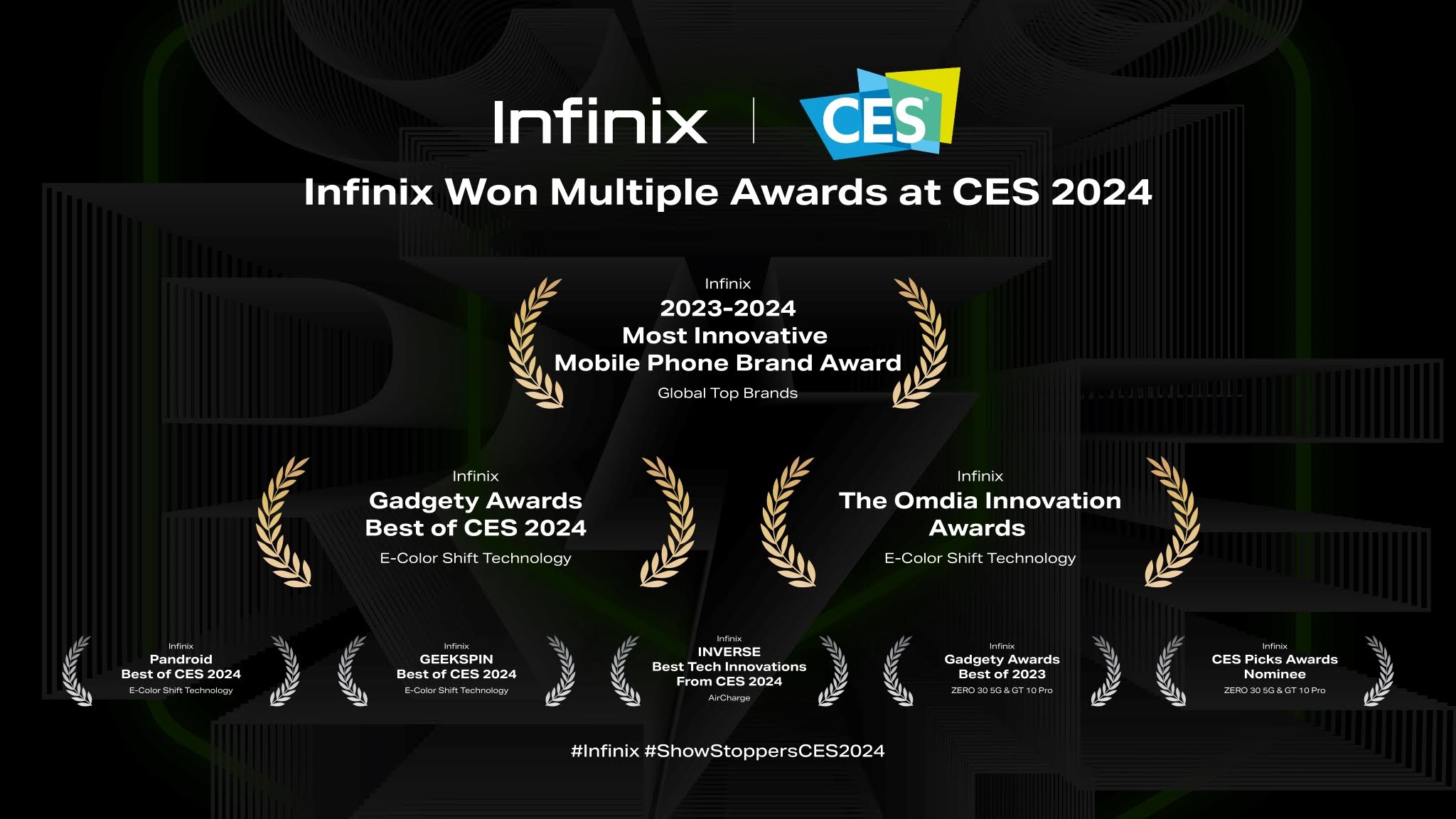 · รางวัล “Best of CES 2024” จาก Gadgety Awards สำหรับเทคโนโลยี Infinix E-Color Shift ที่ชื่นชมว่าเป็นหนึ่งในเทคโนโลยีที่โดดเด่นที่สุดในงาน CES