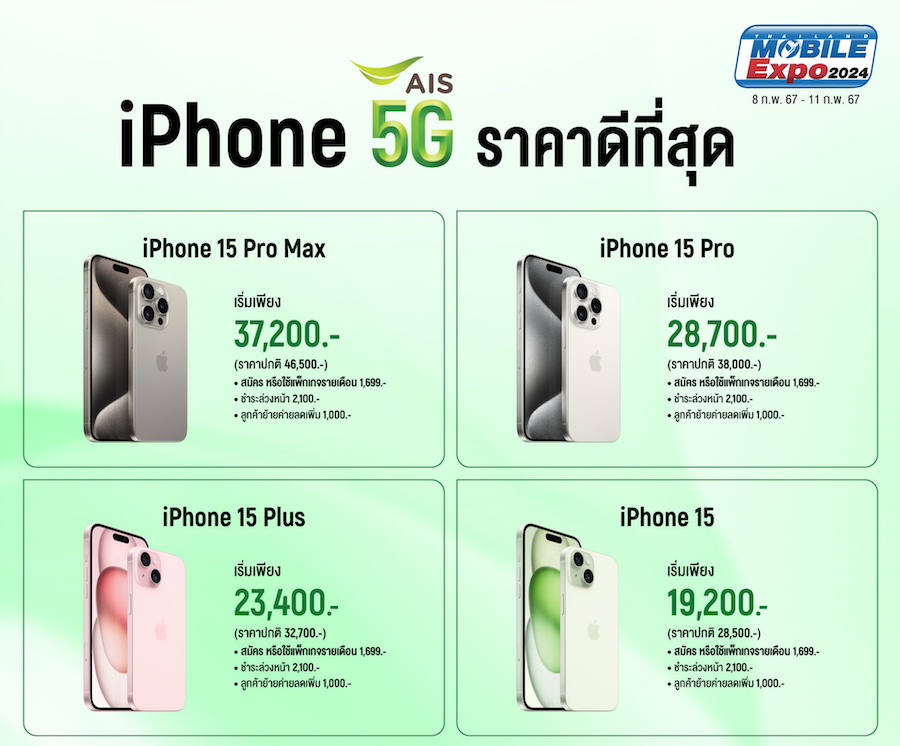 AIS จัดโปรโมชันลดแรงสุดคุ้ม ลดสูงสุด 11,300 บาท iPhone 15 ราคาเริ่มต้น 19,200 บาท iPhone 15 Pro ราคาเริ่มต้น 28,700 บาท พร้อมรับสิทธิ์ลดหย่อนภาษี Easy E-Receipt