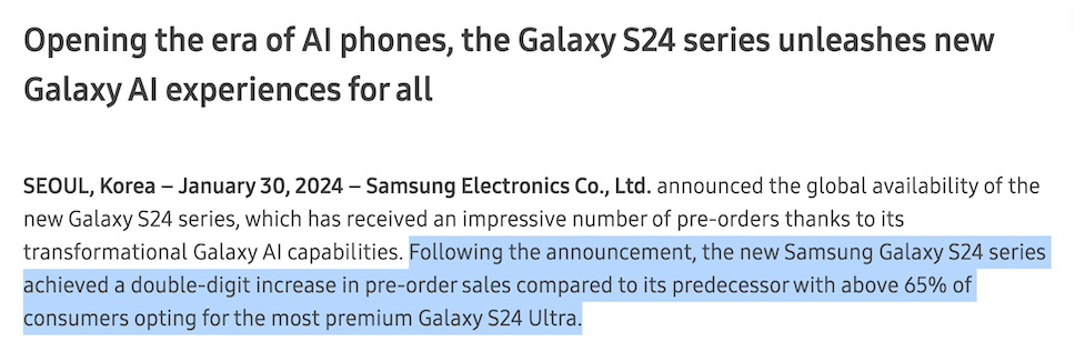 เมื่อวันที่ 30 มกราคมที่ผ่านมา Samsung เปิดเผยว่าสมาร์ตโฟน Galaxy S24 Series มียอดสั่งซื้อล่วงหน้าเพิ่มขึ้นสองหลัก เมื่อเทียบกับรุ่นก่อน โดย Galaxy S24 Ultra เป็นที่ต้องการมากที่สุดด้วยสัดส่วน 65% แต่ไม่ได้ระบุตัวเลขยอดสั่งซื้อที่ชัดเจน