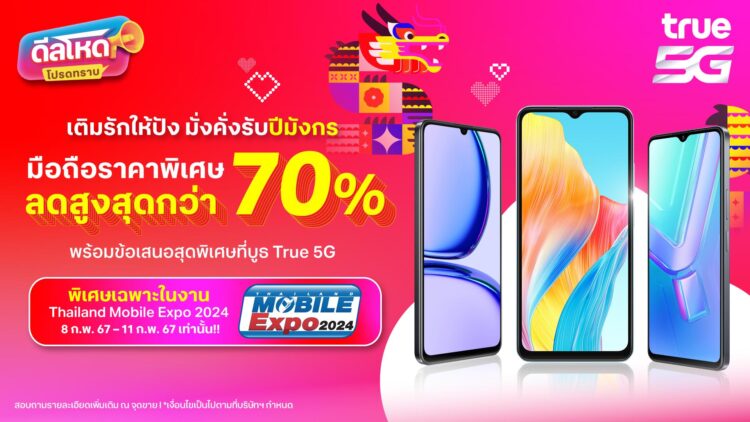 ดีลโหดโปรดทราบ…. พบข้อเสนอสุดปังจากทรู 5G ในงาน “Thailand Mobile Expo 2024” มหกรรมมือถือระดับชาติ พบสมาร์ทโฟนแบรนด์ดังหลากรุ่น พร้อมความคุ้มแบบจัดเต็ม กับ ทรู 5G เติมรักให้ปัง มั่งคั่งรับปีมังกร อาทิ มือถือราคาพิเศษลดสูงสุดกว่า 70% Samsung Galaxy S24 Series ใหม่ล่าสุด! เครื่องเปล่าราคาพิเศษ เก่าแลกใหม่ ลดเพิ่มสูงสุด 6,000 บาท และโค้งสุดท้ายช้อปลดหย่อนภาษี