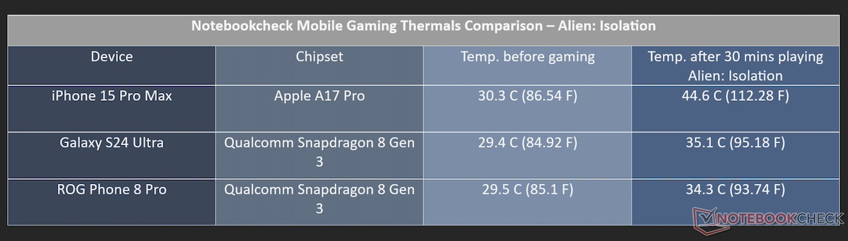 Notebookcheck ได้นำ iPhone 15 Pro Max มาวัดอุณหภูมิ เพื่อดูว่ามีความร้อนขนาดไหนหลังจากเล่นเกม Alien: Isolation นานครึ่งชั่วโมง พร้อมเปรียบเทียบกับ Galaxy S24 Ultra และ ROG Phone 8 Pro (ถึงแม้เกม Alien: Isolation จะไม่ได้เป็นเกมใหม่ แต่ก็ถือเป็นเกมระดับ AAA และมีให้เล่นทั้งบน iOS และ Android)