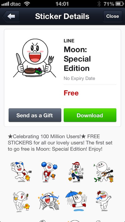 วันนี้ LINE ได้ประกาศความสำเร็จกับจำนวนผู้ใช้ทะลุ 100 ล้านคนทั่วโลก เพื่อเป็นการขอบคุณ LINE ได้ปล่อยสติ๊กเกอร์ชุดพิเศษของ Moon, Brown และ Cony ให้ผู้ใช้ได้ดาวน์โหลดกันฟรี  4 วัน ตั้งแต่วันที่ 18 – 21 มกราคม โดยเริ่มจาก Moon Spacial Edition ที่เริ่มให้ดาวน์โหลดฟรีตั้งแต่วันนี้แล้ว ถึงวันที่ 20 มกราคม จากนั้นจะแจกสติ๊กเกอร์ Cony Special Edition แถึงวันที่ 21 มกราคม และสุดท้ายวันที่  21 มกราคมก็จะแจกสติ๊กเกอร์ Brown Special Edition ถึงวันที่ 22 มกราคมนี้ เป็นแบบสุดท้าย สาวก LINE ห้ามพลาด สามารถเข้าไปดาวน์โหลดได้ฟรีที่ Sticker Shop ทั้งบน iPhone และ Android ได้แล้ววันนี้