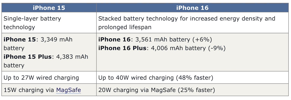 แบตเตอรี่ของ iPhone 16 จะได้รับการปรับปรุงให้มีความหนาแน่นมากขึ้น และมีความจุมากขึ้น ซึ่งควรให้อายุการใช้งานที่ยาวนานกว่าเดิม อีกทั้งยังปรับปรุงการชาร์จให้เร็วขึ้น ทั้งแบบใช้สาย และไร้สาย แต่ iPhone 16 Plus ถูกลือว่าจะมีความจุแบตเตอรี่ลดลงเล็กน้อย