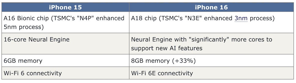 iPhone 16 จะได้รับชิป A18 ซึ่งจะช่วยปรับปรุงประสิทธิภาพขึ้นอย่างมาก เนื่องจากเป็นชิปขนาด 3 นาโนเมตร ใช้เทคโนโลยี N3E ของ TSMC ขณะที่ iPhone 15 ใช้ชิป A16 ซึ่งเป็นชิปขนาด 5 นาโนเมตร อีกทั้งยังมีรายงานว่าชิป A18 จะได้รับการปรับปรุง Neural Engine ให้มีประสิทธิภาพมากขึ้น เพื่อรองรับการใช้งานด้าน Generative AI