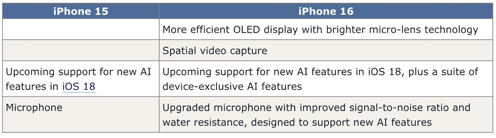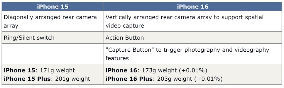 iPhone 16 และ iPhone 16 Plus มีแนวโน้มที่จะได้รับการปรับปรุงกล้องเพื่อรองรับการถ่ายวิดีโอเชิงพื้นที่ (Spatial Video) สำหรับเปิดดูบน Apple Vision Pro นอกจากนี้ ยังมีรายงานว่า iPhone รุ่นใหม่ในปีนี้จะได้รับฟีเจอร์ใหม่ๆ ที่ใช้ AI ผ่านการอัปเดตซอฟต์แวร์ในปลายปีนี้