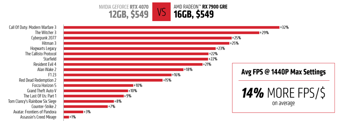 - ประสิทธิภาพที่ยอดเยี่ยม – กราฟิกการ์ด Radeon RX 7900 GRE มาพร้อมหน่วยประมวลผล 80 คอร์ และฟีเจอร์ ray accelerators, GDDR6 VRAM ขนาด 16GB ที่การโอเวอร์คล็อก 18Gbps, AI accelerators จำนวน 160 ชุด, AMD Infinity Cache รุ่นที่สอง ขนาด 64MB และมี TBP ที่ 260W เสนอประสิทธิภาพการเล่นเกมที่ยอดเยี่ยมยิ่งขึ้นในการเล่นเกมชั้นนำในปัจจุบัน ด้วย FPS/$ เฉลี่ยที่สูงขึ้นถึง 14% เมื่อเปรียบเทียบกับ GeForce RTX 4070