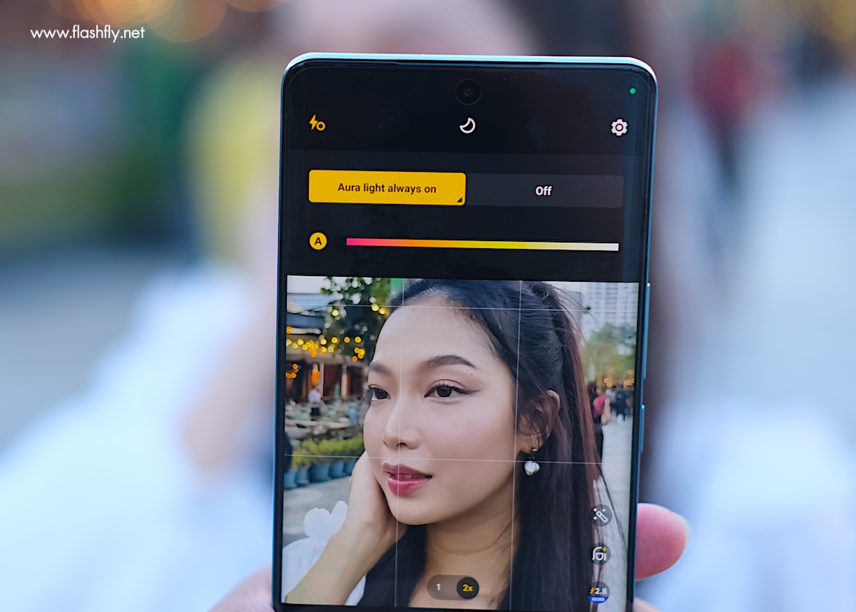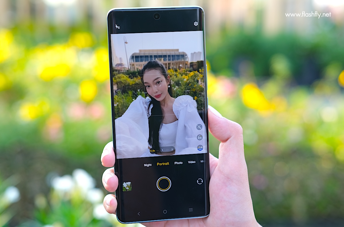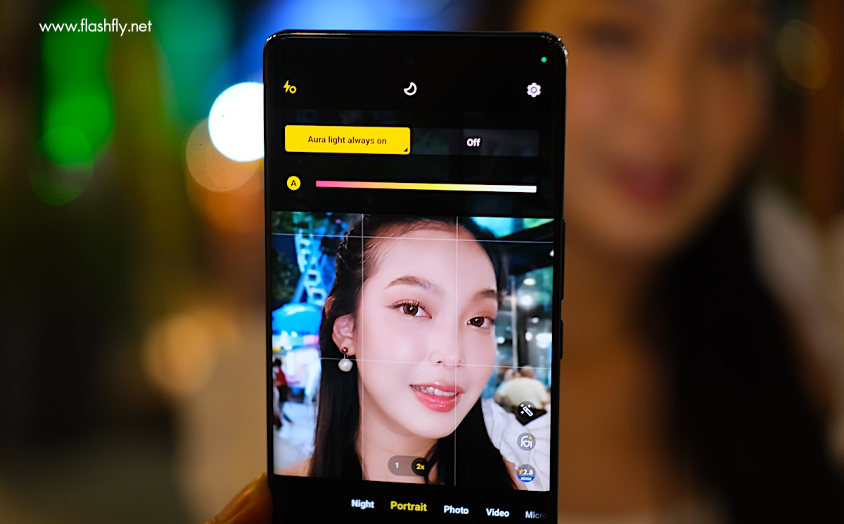 โหมด Portrait สามารถเปิดใช้งานแสง Aura Light ได้จากแถบเครื่องมือด้านบน โดยมีแถบให้เลื่อนปรับแสงสว่างได้ ส่วนการซูมทำได้ 2 ระยะ 1x และ 2x อีกทั้งยังมีฟีเจอร์ Style ให้เลือกใช้หลายแบบ เพื่อทำให้ภาพถ่ายพอร์ตเทรตโดดเด่นมากยิ่งขึ้น พร้อม Filters ช่วยเปลี่ยนโทนสีภาพ รวมถึงโหมด Beauty สำหรับปรับใบหน้าให้ดูดีขึ้น โดยมีฟีเจอร์ Postures ช่วยแนะนำท่าทางการถ่ายภาพ และมีฟีเจอร์ Bokeh สามารถละลายฉากหลังได้หลายระดับ