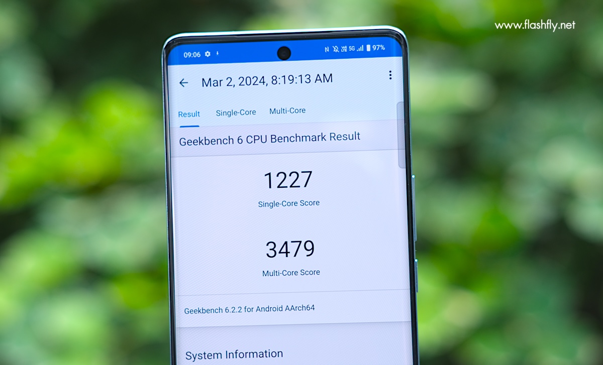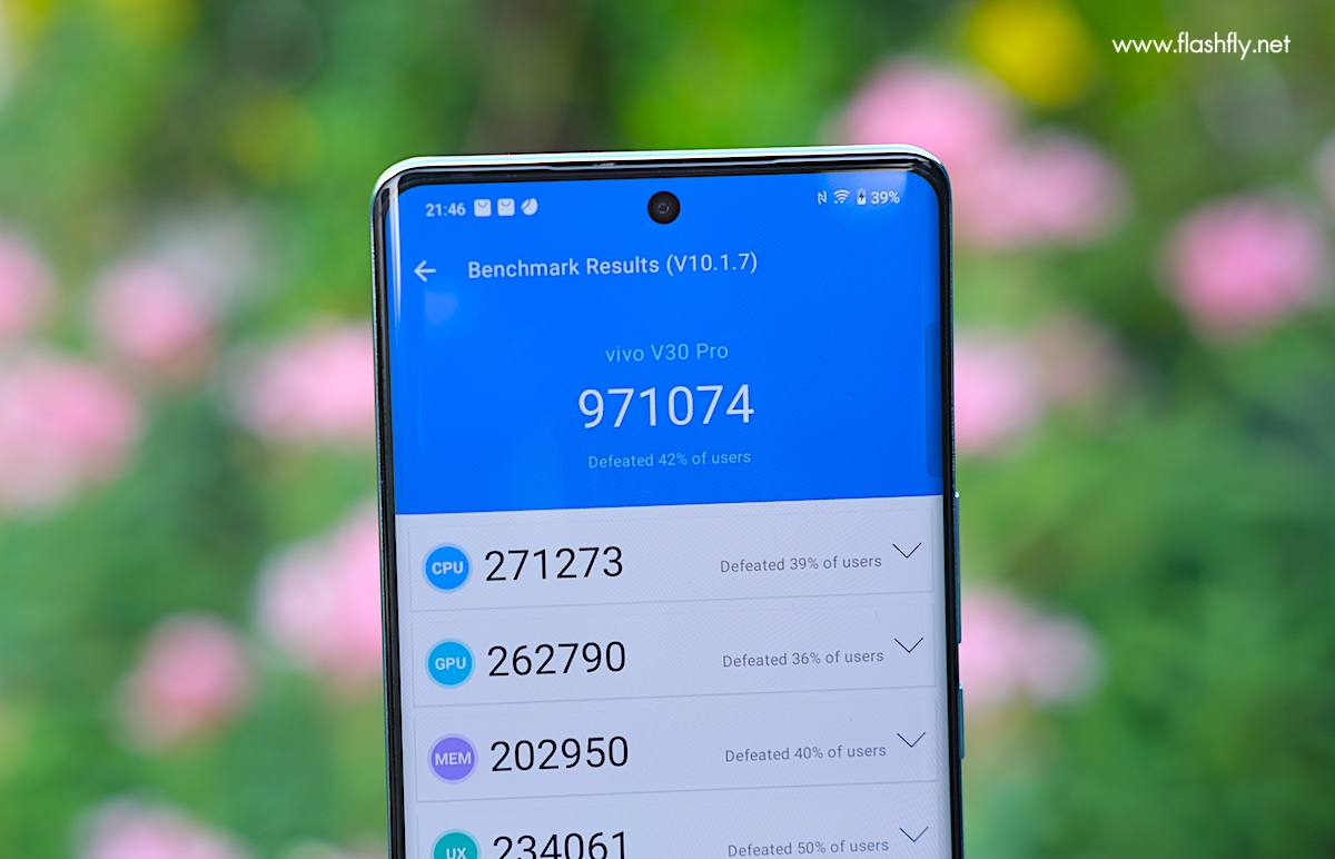 จากการทดสอบด้วยแอปพลิเคชัน AnTuTu พบว่า vivo V30 Pro 5G ทำได้ถึง 978,312 คะแนน โดยจำแนกเป็นประสิทธิภาพ CPU: 274,614 คะแนน, GPU: 262,886 คะแนน, Memory: 205,405 คะแนน และ User Experience: 235,407 คะแนน ส่วนการทดสอบด้วย Geekbench ก็ทำคะแนน Single-Core ได้ 1227 และ 3479 คะแนนแบบ Multi-Core