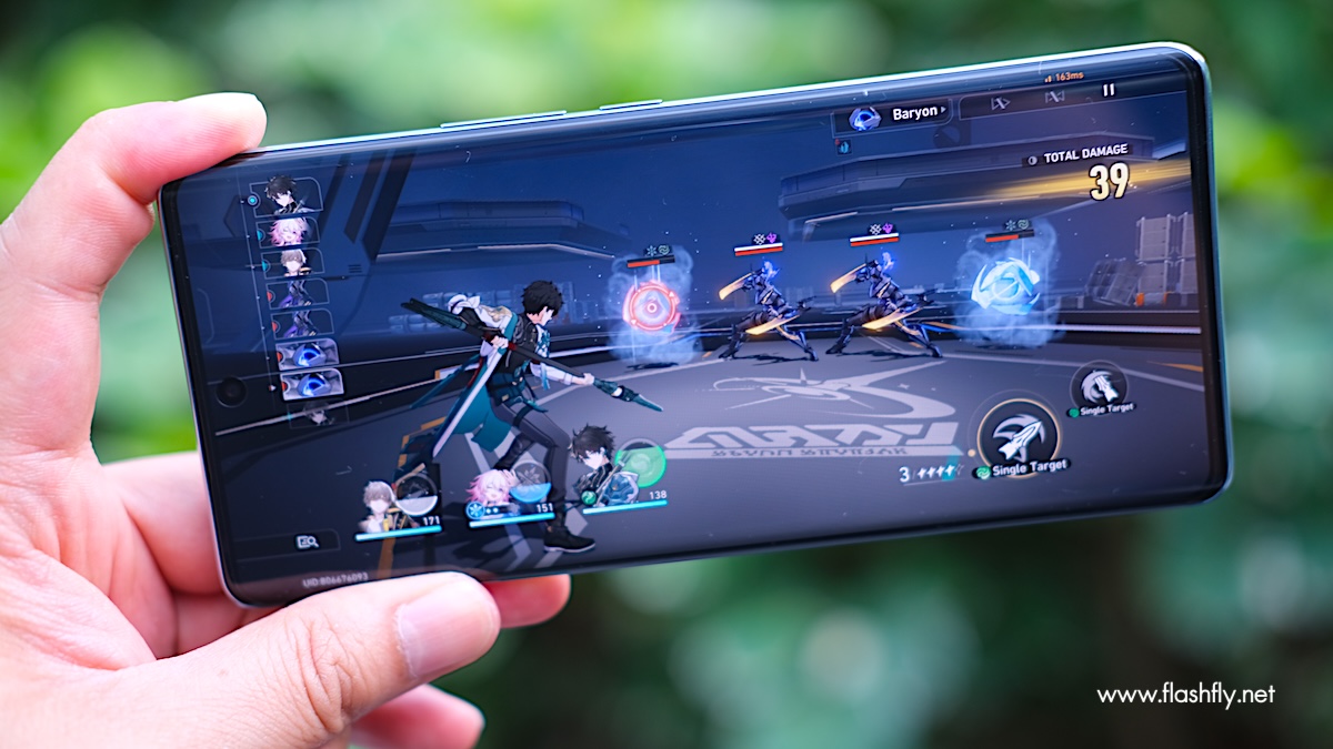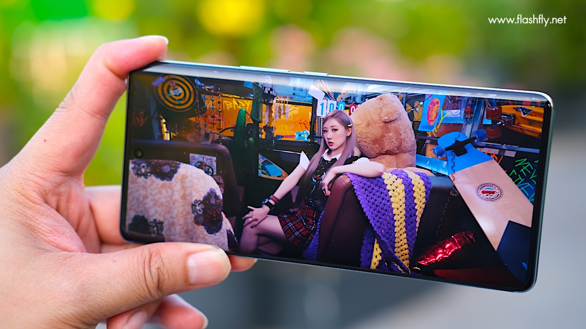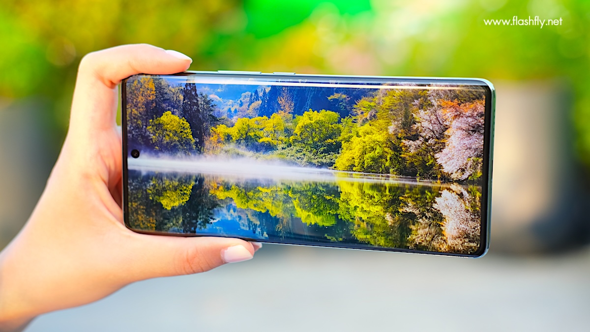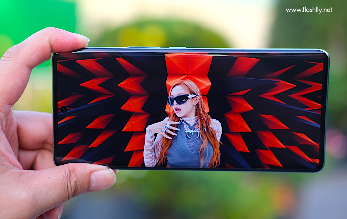 มุมมองด้านหน้ามาพร้อมจอแสดงผล AMOLED ขนาด 6.78 นิ้ว ดีไซน์ขอบหน้าจอโค้ง 3D Curved Screen ติดตั้งเซ็นเซอร์สแกนลายนิ้วมือไว้ใต้หน้าจอ แบบเดียวกับที่พบในสมาร์ตโฟนเรือธง และซ่อนกล้องหน้า 50 ล้านพิกเซล ไว้ในหลุมบนหน้าจอ