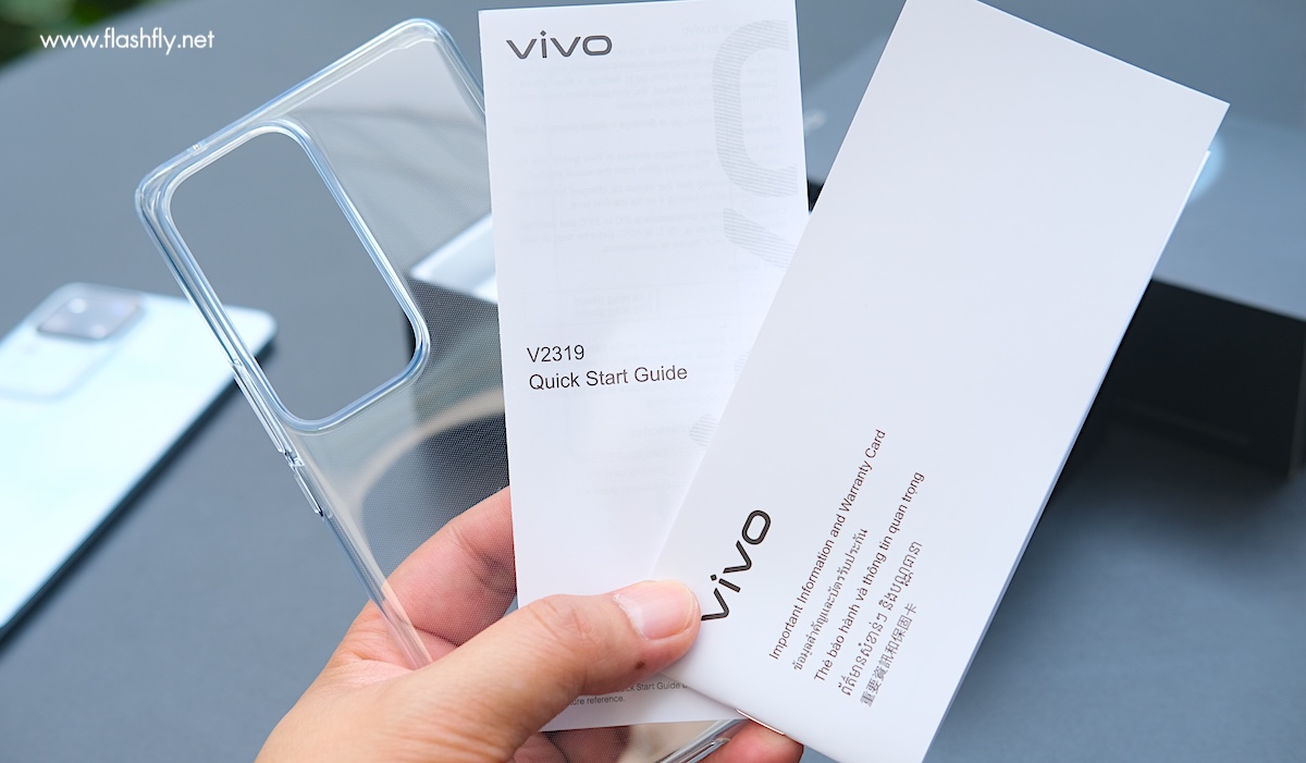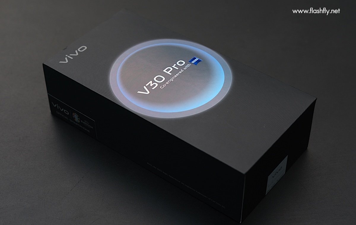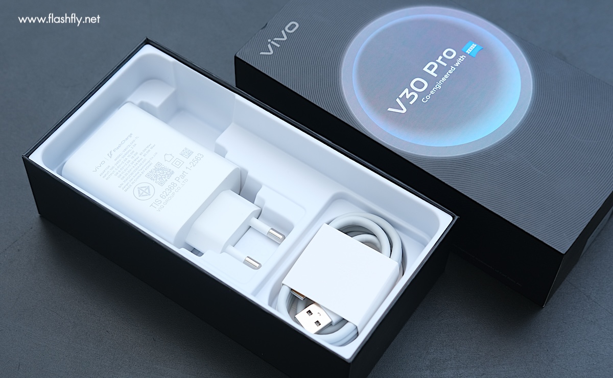 vivo V30 Pro 5G บรรจุไว้ในกล่องสีดำ หน้ากล่องมีชื่อรุ่น V30 Pro ขนาดใหญ่ อยู่ในวงแหวนที่มีแสงออร่า พร้อมข้อความที่บ่งบอกว่ามีการทำงานด้านวิศวกรรมร่วมกันกับ ZEISS ภายในกล่อง แน่นอนว่ามีสมาร์ตโฟน vivo V30 Pro 5G นอกจากนี้ ยังแถมเคส, คู่มือ, ข้อมูลสำคัญและบัตรรับประกัน, เข็มช่วยถอดช่องใส่ซิม, สายชาร์จ และหัวชาร์จ 80W Power Adapter