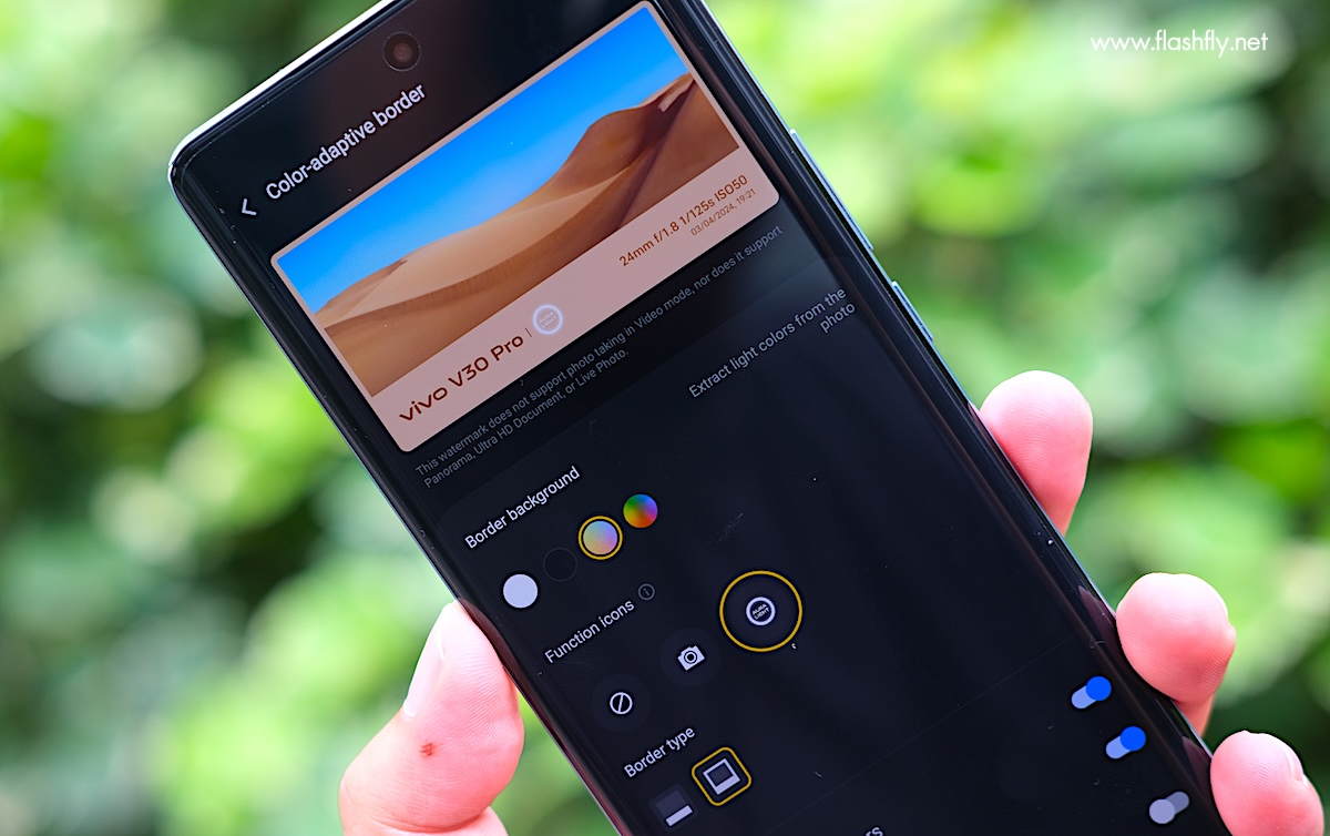 นอกจากโหมดถ่ายภาพต่างๆ vivo V30 Pro 5G ยังมี Color-Adaptive Border หรือ กรอบรูปภาพแบบปรับสีอัตโนมัติ ช่วยสร้างกรอบรูปภาพสไตล์ภาพถ่ายโพลารอยด์ โดยอาศัยอัลกอริทึมขั้นสูงช่วยวิเคราะห์สีสันและองค์ประกอบของภาพอย่างละเอียด เพื่อทำให้กรอบมีสีสันโทนเดียวกับภาพถ่าย