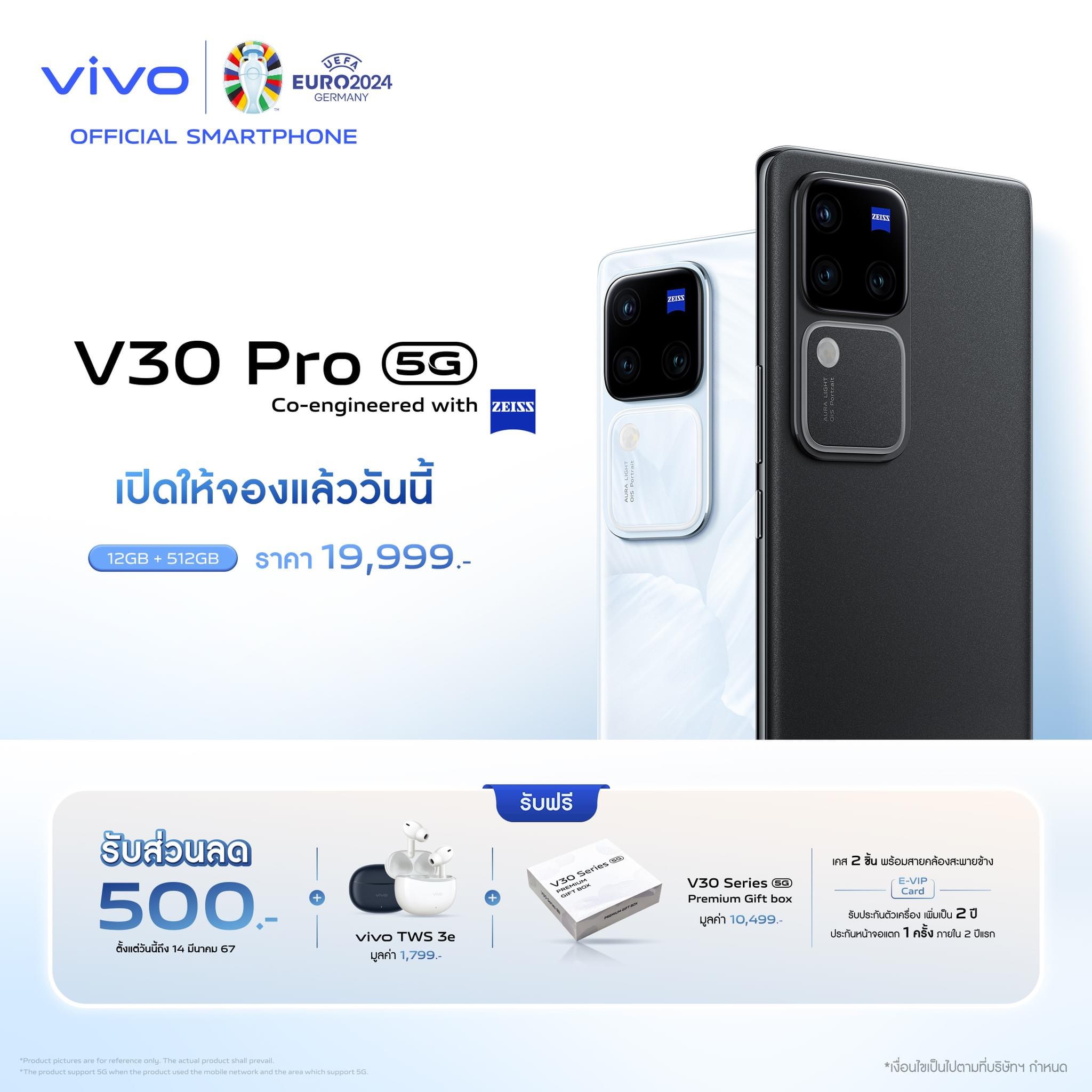 สำหรับผู้ที่สั่งจอง vivo V30 Pro 5G ในระหว่างวันที่ 28 กุมภาพันธ์ ถึง 14 มีนาคม 2567 จะได้รับของสมนาคุณรวมมูลค่ากว่า 12,798 บาท ได้แก่ ส่วนลด 500 บาท หูฟัง vivo TWS 3e มูลค่า 1,799 บาท และ V30 Series 5G Premium Gift Box มูลค่า 10,499 บาท ภายในประกอบไปด้วย กล่องเคส 2 ชิ้น และ E-VIP Card สิทธิพิเศษรับประกันตัวเครื่องเป็น 2 ปี และรับประกันหน้าจอแตก 1 ครั้ง ภายใน 2 ปีแรก)