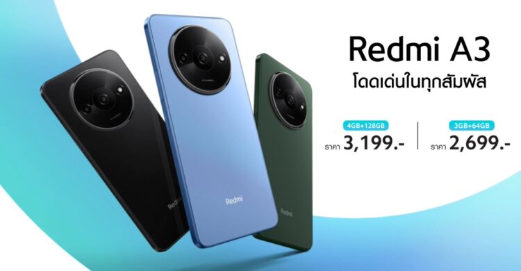 สมาร์ตโฟนสุดคุ้ม Redmi A3 พร้อมวางจำหน่ายในไทยแล้ว โดยชูจุดเด่นที่ดีไซน์หรูหราเกินราคา มีให้เลือก 3 สี ได้แก่ Forest Green, Star Blue และ Midnight Black มาพร้อมกรอบวงแหวนขนาดใหญ่ของกล้องหลัง